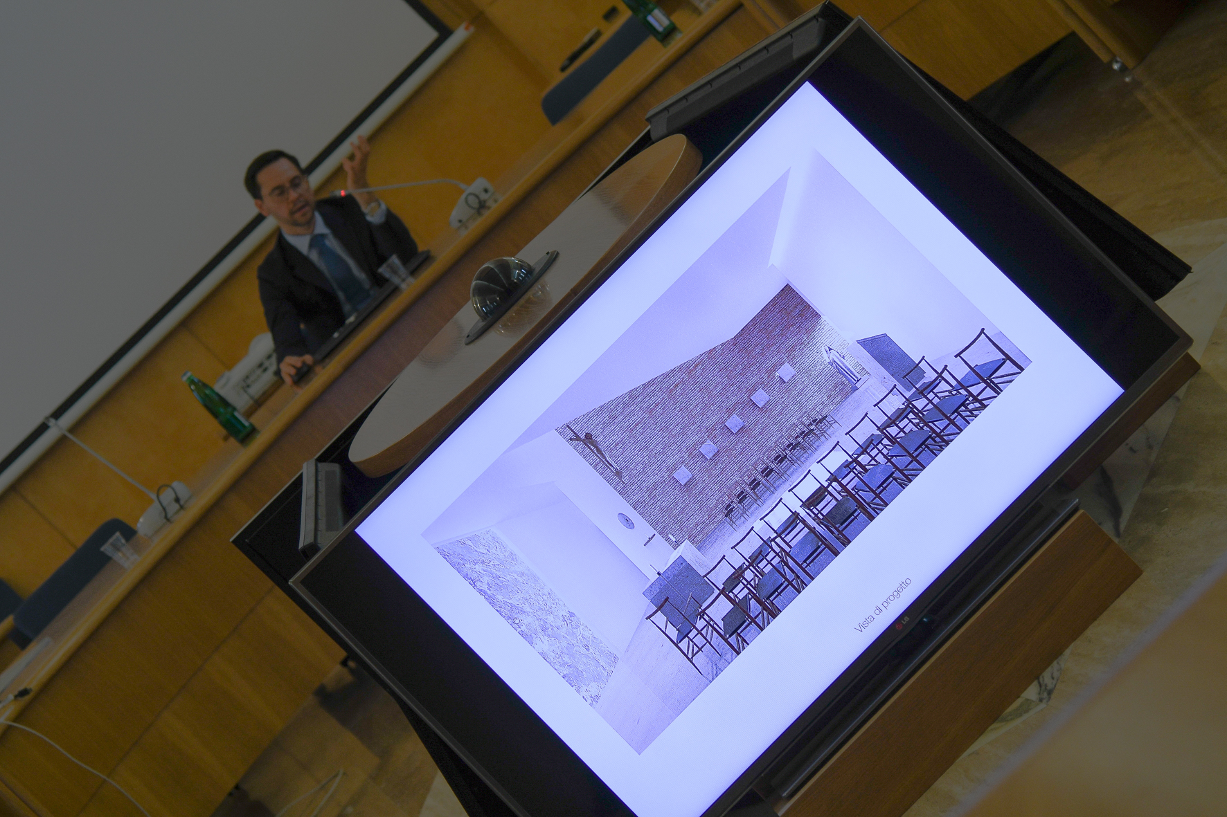 È arrivato a conclusione il concorso di idee per l’allestimento di un adeguato spazio liturgico della cappella del Centro servizi di via Aurelia 796, a Roma. Questa mattina si è svolta la premiazione del progetto vincitore dell’arch. Felice De Silva assieme a tutto il gruppo di collaboratori, e l’attribuzione di 2 menzioni per i progetti dell’arch. Francesco Polci e dell’arch. Alessandro Braghieri assieme a Fabrizio Dieci. “Il progetto è partito da un ragionamento molto semplice: evitare in un luogo così importante la riproposizione di uno schema statico e di tipo teatrale. Cioè uno spazio dove tutto è allestito, tutto è predisposto e l’assemblea guarda come uno spettacolo teatrale quello che accade sul presbiterio”. Sono queste le parole dell’arch. De Silva, vincitore del concorso assieme al gruppo composto dall’arch. Manuela Antoniciello, l’arch. Davide Apicella, don Marco Valentini, l’artista Egidio Iovanna ed i prof. e arch. Enrico Sicignano e Pierfrancesco Fiore.