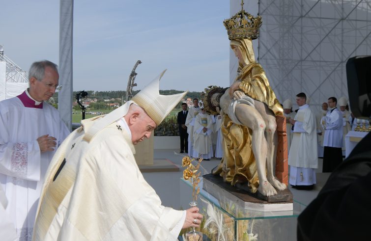 “La fede di Maria è una fede che si mette in cammino”. Lo ha spiegato il Papa, nell’omelia della messa al santuario di Sastin, dove è venerata la Madonna dei Sette Dolori, patrona della Slovacchia e di cui oggi si celebra la festa nazionale. “Alla comodità delle abitudini preferisce le incognite del viaggio, alla stabilità della casa la fatica della strada, alla sicurezza di una religiosità tranquilla il rischio di una fede che si mette in gioco, facendosi dono d’amore per l’altro”, ha spiegato Francesco: “Anche il Vangelo di oggi ci fa vedere Maria in cammino: verso Gerusalemme dove, insieme a Giuseppe suo sposo, presenta Gesù nel Tempio. E tutta la sua vita sarà un cammino dietro al suo Figlio, come prima discepola, fino al Calvario, ai piedi della Croce. Sempre Maria cammina”. “Così, la Vergine è modello della fede di questo popolo slovacco”, il commento del Papa: “Una fede che si mette in cammino, sempre animata da una devozione semplice e sincera, sempre in pellegrinaggio alla ricerca del Signore. E, camminando, voi vincete la tentazione di una fede statica, che si accontenta di qualche rito o vecchia tradizione, e invece uscite da voi stessi, portate nello zaino le gioie e i dolori, e fate della vita un pellegrinaggio d’amore verso Dio e i fratelli. Grazie per questa testimonianza! E per favore, restate in cammino!”.