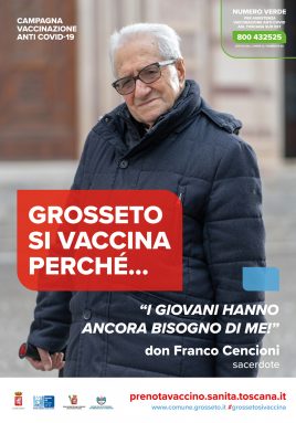 “Figlio di minatori, nel suo paese natale, Boccheggiano, ha visto la guerra, i bombardamenti, la miseria… Figurarsi se, alla soglia del secolo di vita, don Franco Cencioni, prete della diocesi di Grosseto, si può far impensierire da qualche sfottò o perfino attacco polemico per aver prestato il volto su manifesti e gigantografie per la campagna promossa dall’amministrazione comunale – spiega Toscana Oggi -. Lo hanno ritratto tra la cattedrale di San Lorenzo, di cui è stato parroco per trent’anni, e il palazzo municipale. Andando a spasso con lui lungo il corso cittadino, non c’è grossetano – baciapile o mangiapreti – che non lo saluti. E non c’è saluto a cui non risponda. È così che il Comune ha pensato a lui quando si è trattato di individuare cinque persone della Città che potessero credibilmente invitare i grossetani a vaccinarsi”.