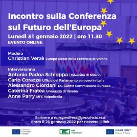 Un terzo momento, on line la mattina del 31 gennaio, è quello organizzato da Europe direct di Verona e dal Movimento federativo europeo Valpolicella (iscrivendosi entro oggi, europedirect@provincia.vr.it). A parlare della Conferenza sul futuro dell’Europa saranno Antonio Padoa-Schioppa (Università di Milano), Carlo Corazza (responsabile Ufficio del Parlamento europeo in Italia), Alessandro Giordani (direzione generale comunicazione, da Bruxelles), Caterina Fratea (Università di Verona) e Anne Parry (Mfe Valpolicella), moderati da Christian Verzè, dell’antenna Europe direct della provincia di Verona.