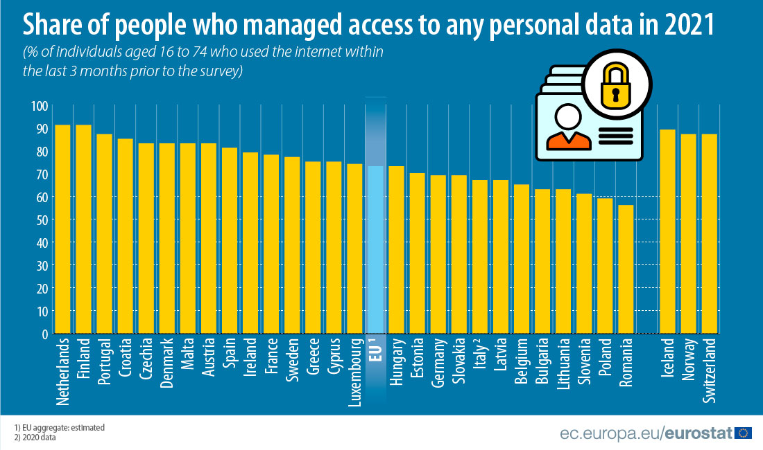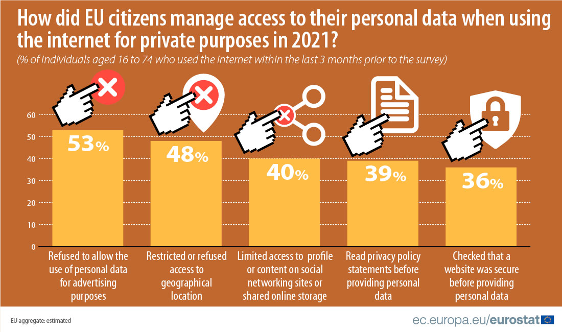 Il 53% degli utenti di internet ha rifiutato il consenso all’utilizzo dei dati personali per la pubblicità quando si è messo a navigare sui siti on line per scopi privati; il 48% ha limitato o rifiutato l’accesso alla propria posizione geografica; il 40% ha limitato l’accesso al proprio profilo o a contenuti sui siti di social network o su archivi online condivisi. È solo il 39% che ha letto le informative sulla privacy prima di fornire i dati personali e solo il 36% ha verificato che il sito web a cui ha fornito i propri dati personali sia sicuro. Questi i dati di Eurostat che, alla vigilia della Giornata internazionale per la protezione dei dati, fotografano un aspetto particolare del comportamento degli europei quando si mettono a navigare sul web. La percentuale di persone che ha gestito su internet i propri dati personali nel 2021 varia da un massimo del 91% di abitanti nei Paesi Bassi e Finlandia, seguite dall’89% in Portogallo, fino al minimo del 56% in Romania. Alle posizioni più basse della classifica ci sono anche Polonia (59%) e Slovenia (61%). In Italia la fetta è di circa il 70%, mentre la media europea è poco inferiore all’80%.