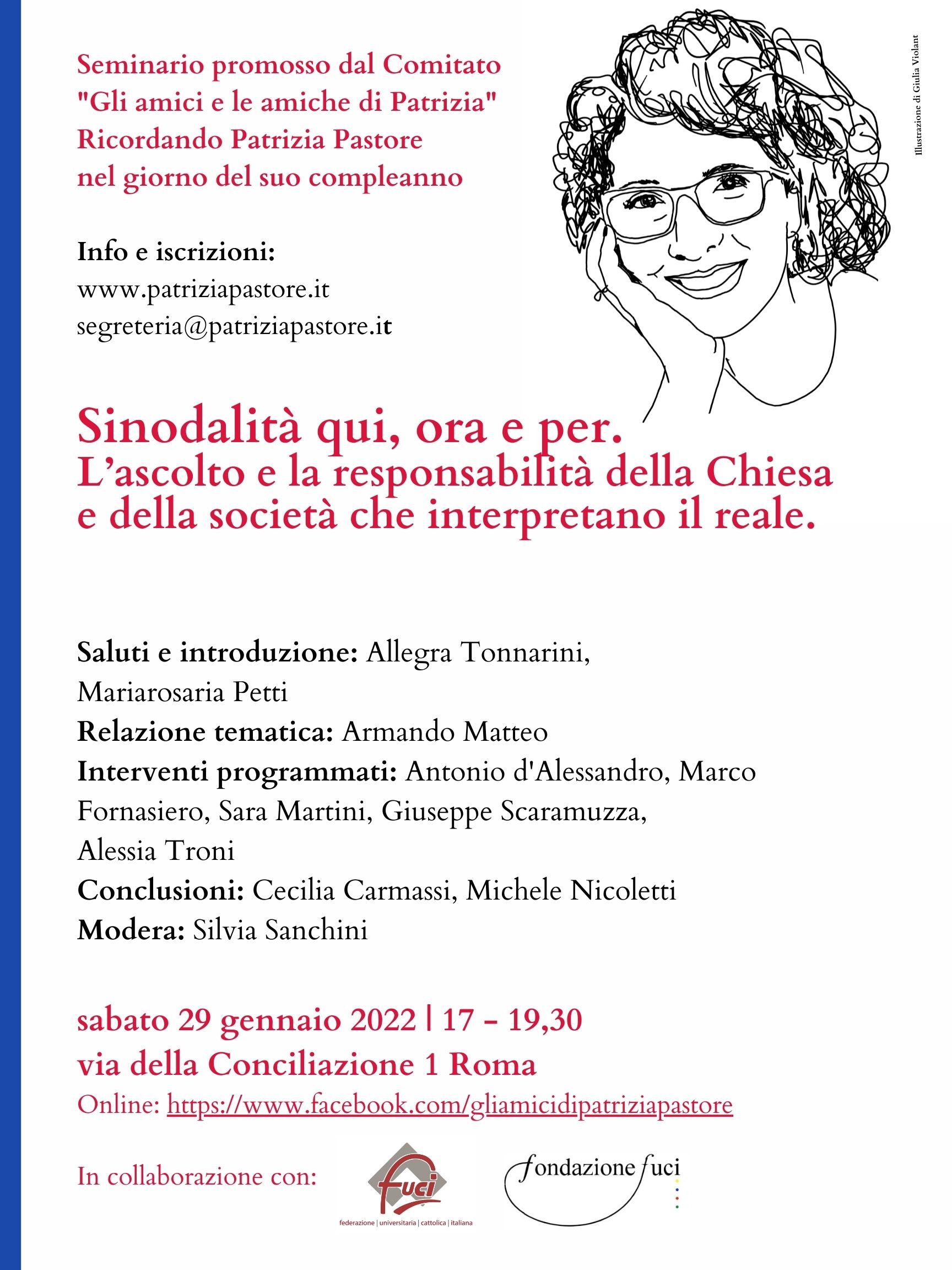 Il Comitato “Gli amici e le amiche di Patrizia” ricorda Patrizia Pastore (nella foto) con un seminario dal titolo “Sinodalità qui, ora e per. L’ascolto e la responsabilità della Chiesa e della società che interpretano il reale”. Il seminario si svolge sabato 29 gennaio dalle 17 alle 19.30 in via della Conciliazione 1, a Roma, e in diretta sulla pagina Facebook “Gli amici e le amiche di Patrizia”.