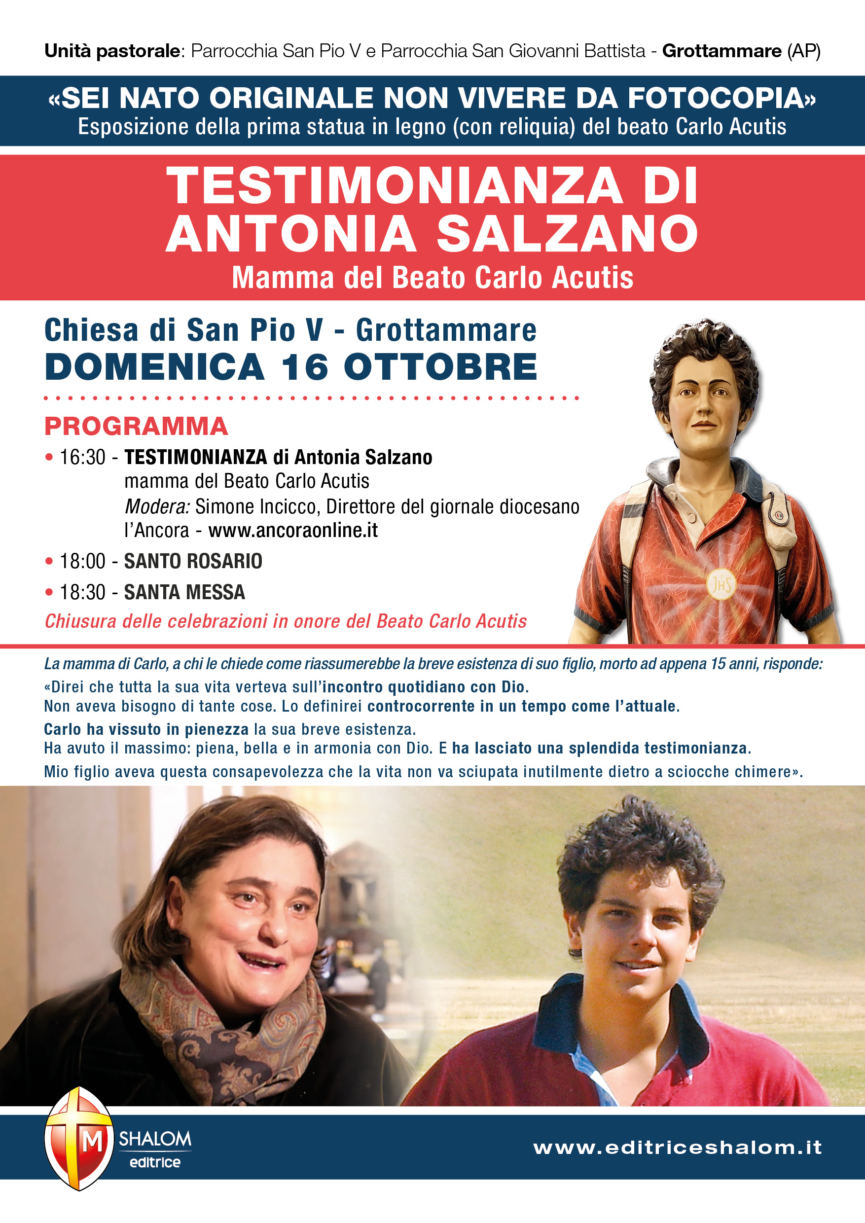Si terrà domenica 16 ottobre alle ore 16.30, presso la parrocchia San Pio V di Grottammare, l’incontro con la mamma del beato Carlo Acutis, Antonia Salzano. In questi giorni è partita anche una bella iniziativa portata avanti dal Giornale Grottammare che ha deciso di sostenere alcuni parrocchiani della Chiesa di San Pio V nell’acquisto della statua del beato Carlo Acutis. C’è bisogno di 250 persone disponibili a versare minimo 50 euro. Tutti coloro che aderiranno all’iniziativa avranno il proprio nome (a meno che non si voglia donare in maniera anonima) sulla targa che verrà posizionata ai piedi della statua dove tutti i benefattori saranno affidati all’intercessione del beato Carlo. Sono già arrivate circa 50 adesioni, tra cui quella di una famiglia musulmana. I festeggiamenti in onore del beato Carlo Acutis si sono aperti a Grottammare con l’accoglienza della statua e della reliquia il 2 ottobre e sono proseguiti con la novena iniziata il 4 e che si concluderà il 12 ottobre. Le celebrazioni si concluderanno il 16 ottobre alle 18.30 con la messa.