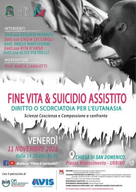 “Fine vita & Suicidio assistito – Diritto o scorciatoia per l’eutanasia. Scienza, coscienza e compassione a confronto”. Questo il titolo di un convegno promosso dall’arcidiocesi di Urbino che si terrà venerdì 11 novembre dalle 14.30 alle 20 all’interno della chiesa di San Domenico in piazza Rinascimento a Urbino. Il convegno – si legge in un comunicato diffuso dall’arcidiocesi – ha il patrocinio dell’Opi (Ordine professioni infermieristiche) di Pesaro-Urbino e dell’Avis di Sant’Angelo in Vado. Ha anche ricevuto l’accreditamento Ecm per l’assegnazione di crediti formativi ed è rivolto alle categorie professionali accreditate come medico chirurgo di tutte le specializzazioni, odontoiatria, psicologo, assistente sanitario, infermiere, insegnante di religione, studenti di scienze religiose. Per iscrizioni inviare richiesta a Apsi (www.professionisanitarie.com).