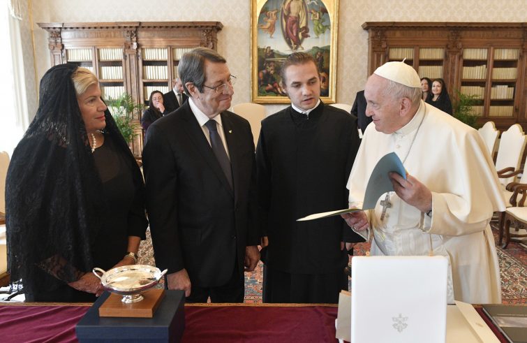 È durato circa 25 minuti il colloquio privato tra il Papa e il presidente della Repubblica di Cipro, Nicos Anastasiades il quale si è successivamente incontrato con il cardinale segretario di Stato, Pietro Parolin, accompagnato da mons. Paul Richard Gallagher, segretario per i Rapporti con gli Stati e le Organizzazioni Internazionali. “Nel corso dei cordiali colloqui in Segreteria di Stato – informa la Sala Stampa della Santa Sede – è stato espresso apprezzamento per i buoni rapporti bilaterali esistenti e l’intenzione di sviluppare ulteriormente la collaborazione nei settori di mutuo interesse, tra cui l’accoglienza dei rifugiati. Inoltre si è parlato del processo di riunificazione dell’Isola e della situazione nel Mediterraneo orientale e nell’intera Regione, auspicando che i problemi aperti siano affrontati attraverso il dialogo”. Il Papa ha donato ad Anastiasiades un mosaico raffigurante “Gesù Buon Pastore, che conosce le sue pecore e ‘sente l’odore del suo gregge’”. Nel donarlo al presidente, rivolgendosi a lui, il Papa ha spiegato di averlo scelto perché “lei conosce il suo popolo col cuore, sta vicino al popolo”. Gli altri doni di Francesco – come è consueto con i Capi di Stato – sono stati i volumi dei documenti papali, il Messaggio per la Pace di quest’anno, il Documento sulla Fratellanza Umana e il libro sulla Statio Orbis del 27 marzo 2020, a cura della Lev. Il presidente cipriota ha donato al Papa una coppa in argento.