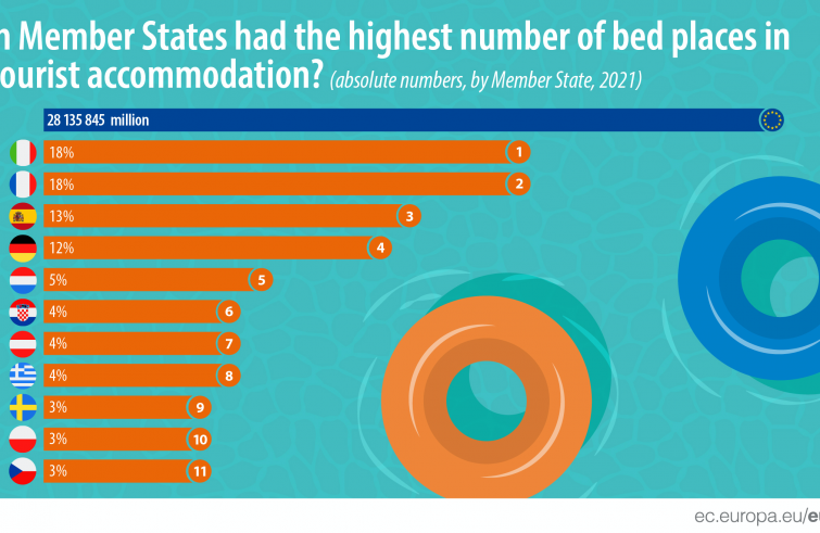 In 2021, the EU had an estimated total of 28.1 million bed places available across 597,000 tourist establishments. According to Eurostat, Italy and France “account for slightly more than one third of the total available capacity”, with 5.1 million bed places each. These Member States are followed by Spain (3.8 million bed places, representing 13% of the total) and Germany (3.5 million; 12%). “Compared with 2020, the year the COVID-19 pandemic started, the number of bed places and the number of establishments remained stable. However, compared with 2019, the number of bed places in 2021 is still -2% (28.8 million) and the number of establishments is even lower (-3%; total of 617,953 establishments)”. Data for 2021 “show that three-quarters (75%) of the 591 million nights spent by international guests in EU tourist accommodation were by tourists coming from other EU Member States, while 16% were spent by tourists coming from other European countries (of which nearly half were UK residents). In 2021, tourists from North America represented 4% of the total nights spent by international guests in EU tourist accommodations, while guests from Asia represented 2%, Central and South America 1%, Africa almost 1%, and Oceania 0.2%.