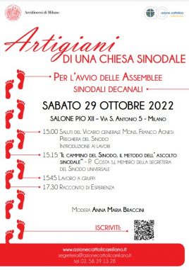 “Artigiani di una Chiesa sinodale”: è il titolo di un convegno organizzato dalla diocesi di Milano e dall’Azione cattolica ambrosiana “per sostenere l’imminente avvio delle Assemblee sinodali decanali”. L’appuntamento è in programma sabato 29 ottobre, dalle 15, nel Salone del Centro diocesano Ac di via Sant’Antonio 5. “Dopo la creazione dei Gruppi Barnaba che hanno lavorato nello scorso anno e che costituiscono i primi nuclei delle Assemblee – si legge nel portale della diocesi – ora prosegue il percorso per il consolidamento di queste nuove forme di presenza della Chiesa, che hanno l’obiettivo di ‘ascoltare e leggere il territorio per individuare le priorità che la missione impone’ e di ‘aiutare le comunità pastorali e le parrocchie a rivolgere lo sguardo oltre l’organizzazione interna’”.