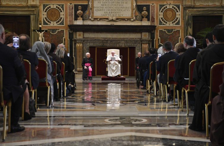 “Ascoltare, camminare e annunciare fino alle periferie”. Così il Papa, ricevendo in udienza i membri del Coordinamento per l’VIII Centenario Francesco ha sintetizzato l’eredità del “poverello di Assisi”, che “davanti al Crocifisso, sente la voce di Gesù che gli dice: ‘Francesco, va’ e ripara la mia casa’”. “E il giovane Francesco risponde con prontezza e generosità a questa chiamata del Signore: riparare la sua casa”, ha ricordato il Papa: “Ma quale casa? Piano piano, si rende conto che non si trattava di fare il muratore e riparare un edificio fatto di pietre, ma di dare il suo contributo per la vita della Chiesa; si trattava di mettersi a servizio della Chiesa, amandola e lavorando perché in essa si riflettesse sempre più il volto di Cristo”. Francesco d’Assisi, inoltre, “è stato un viandante mai fermo, che ha attraversato a piedi innumerevoli borghi e villaggi d’Italia, non facendo mancare la sua vicinanza alla gente e azzerando la distanza tra la Chiesa e il popolo”. “Questa medesima capacità di ‘andare incontro’, piuttosto che di ‘attendere al varco’, è lo stile di una comunità cristiana che sente l’urgenza di farsi prossima piuttosto che ripiegarsi su sé stessa”, la consegna del Pontefice, che ha proseguito a braccio: “Questo ci insegna che chi segue S. Francesco deve imparare ad essere fermo e camminante: fermo nella preghiera, e poi camminare, andare avanti nella testimonianza di Cristo”. Infine, “annunciare fino alle periferie”: “Ciò di cui tutti hanno bisogno – per il Papa – è giustizia, ma anche fiducia. Solo la fede restituisce a un mondo chiuso e individualista il soffio dello Spirito. Con questo supplemento di respiro le grandi sfide presenti, come la pace, la cura della casa comune e un nuovo modello di sviluppo potranno essere affrontate, senza arrendersi ai dati di fatto che sembrano insuperabili”.
