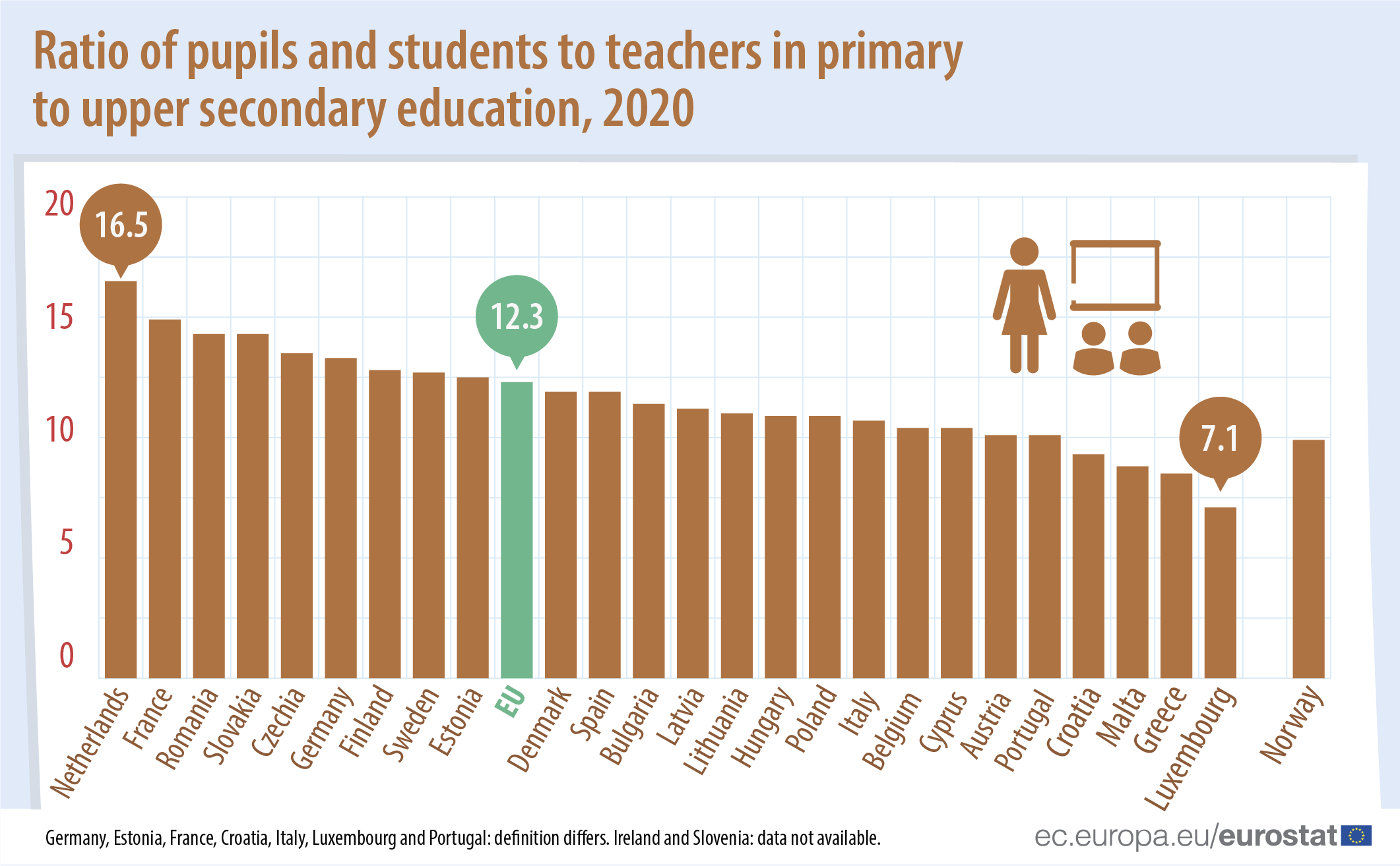Eurostat oggi dice che ci sono 5,2 milioni di insegnanti nell’Ue (dati 2020); il 7% (388mila) ha meno di 30 anni, il 39% oltre 50 anni. Il 47% degli insegnanti maschi con più di 50 anni insegna nell’istruzione secondaria superiore e solo il 17% nella scuola primaria. Quanto alle donne, nell’istruzione primaria sono il 40%, nella secondaria inferiore il 32% e in quella superiore il 28%. Ma il 73% degli insegnanti nelle scuole di ogni ordine e grado è donna. Il numero medio di alunni per insegnante è di 12,3.