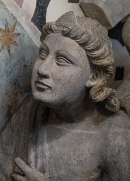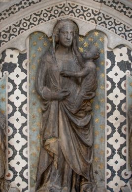 “Rimuovendo considerevoli depositi di sporco superficiale e fenomeni di degrado di varia natura – si legge in un comunicato dell’Opera di Santa Maria del Fiore – i restauratori hanno portato alla luce la preziosa decorazione damascata della veste del Bambino, priva della lama metallica oramai perduta, la pupilla dell’occhio sinistro della Vergine e, in aree circoscritte, il colore azzurro – verde dell’interno del manto della Vergine e tracce di rosso sull’esterno oltre i toni di panna-avorio della veste dell’angelo sinistro. È la prima volta che vengono ritrovate tracce così estese di colore su sculture che decorano o decoravano l’esterno del Duomo di Firenze. In precedenza erano stati individuati minuscoli segni di doratura e di colore azzurro su altre sculture della cattedrale”.