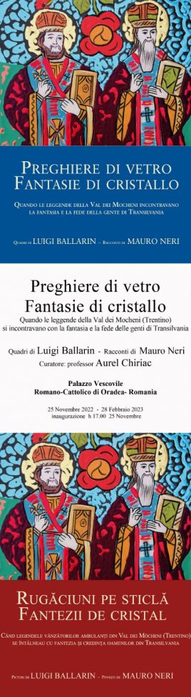 S’intitola “Preghiere di vetro – Fantasie di cristallo” l’evento artistico che Luigi Ballarin, pittore veneto, e Mauro Neri, giornalista e scrittore trentino, inaugureranno venerdì, 25 novembre, a Oradea, nel nord-ovest della Romania. Ispirato alle icone romene dipinte sul vetro, Ballarin propone ventuno icone, delle quali venti su vetro e una su tela, realizzate in un’interpretazione artistica personale. Le icone sono accompagnate da una quindicina di racconti scritti da Mauro Neri, nei quali le leggende trentine si alternano con quelle romene. Secondo un comunicato stampa di Uzzoart, questa non è la prima collaborazione tra Luigi Ballarin e Mauro Neri: i due artisti hanno fatto il giro dell’Europa, tra 2019-2020, con un altro progetto artistico. All’inaugurazione – che sarà alla presenza dei due artisti italiani –, prenderanno la parola i vescovi di Oradea László Böcskei (romano-cattolico) e Virgil Bercea (greco-cattolico). La mostra è ospitata nello spazio del museo della diocesi romano-cattolica di Oradea e rimarrà aperta al pubblico fino il 28 febbraio 2023. Poi, nell’autunno del 2023 arriverà a Trento. Le icone sul vetro, come categoria artistica, fanno parte dell’universo popolare romeno specifico della regione Transilvania. L’arte della pittura iconica sul vetro risale ai secoli XVII-XVIII ed è caratterizzata da un disegno e una composizione semplici, equilibrate dal punto di vista cromatico, senza prospettiva o proporzioni anatomiche.