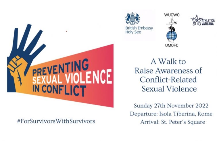 Una passeggiata per aumentare la consapevolezza sulla violenza sessuale come arma di guerra nei conflitti nel mondo e rafforzare l’azione globale di contrasto. Ad organizzarla domenica 27 novembre a Roma (ore 10-12) alla vigilia della Conferenza internazionale Preventing Sexual Violence in Conflict (Londra, 28 – 29 novembre) sono l’Ambasciata del Regno unito presso la Santa Sede, la World Union of Catholic Women’s Association (Wucwo) e la squadra sportiva Athletica Vaticana. Il ritrovo è alle 10 in piazza San Bartolomeo all’Isola (Isola Tiberina) da dove, percorrendo la ciclabile lungo il Tevere (3 km) fino a Ponte Sant’Angelo, si arriverà in piazza San Pietro per partecipare alle 12 all’Angelus con Papa Francesco. Christopher Trott, ambasciatore del Regno unito presso la Santa Sede, guiderà la marcia insieme a Maria Lía Zervino, presidente generale Wucwo, e a Giampaolo Mattei, presidente di Athletica Vaticana.