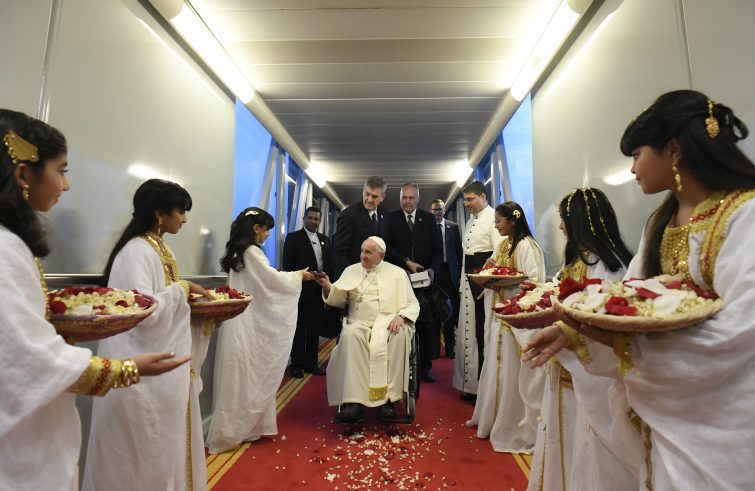 Papa Francesco è arrivato in Bahrein, per il suo 39° viaggio apostolico internazionale che lo tratterrà nel Paesi insulare fino al 6 novembre. Al Suo arrivo alla Sakhir Air Base di Awali, la seconda città del Paese, a circa 30 chilometri dalla capitale Manama, il Papa è accolto dal Re del Bahrein, Sua Maestà Hamad bin Isa bin Salman Al Khalifa, dal Principe ereditario e Primo Ministro, da altri tre figli del Re e da una nipote. Alcuni bambini in abito tradizionale spargono petali di rose mentre il Papa e i Reali attraversano la Guardia d’Onore, salutano le rispettive Delegazioni e raggiungono la Royal Hall dove si svolge un breve incontro privato. Al termine il Papa e i Reali del Bahrein salutano il Grande Imam di al-Azhar, Ahmad Muhammad Al-Tayyeb. Quindi il Santo Padre si trasferisce in auto al Sakhir Royal Palace per la visita di cortesia al Re del Bahrein.