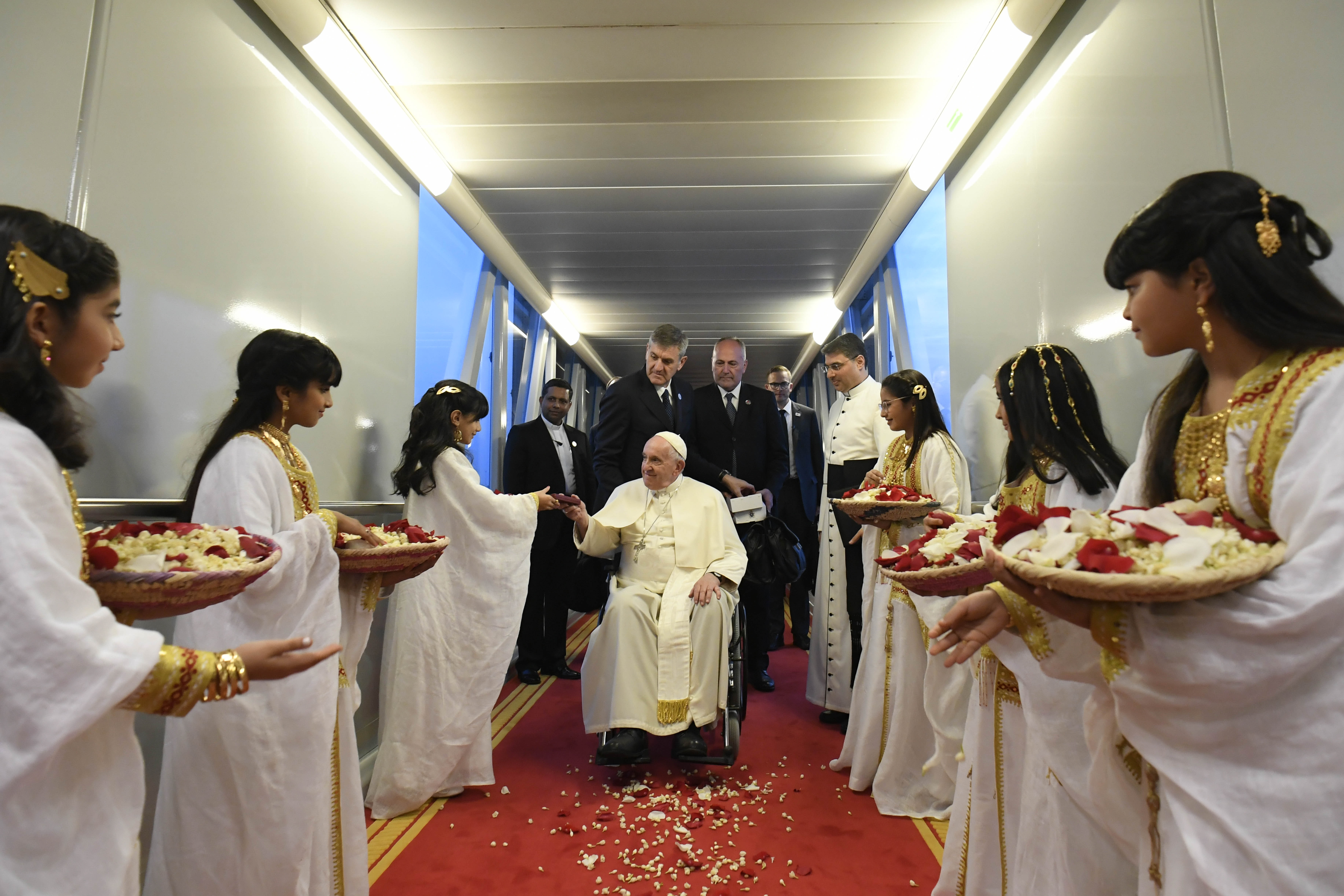 Papa Francesco è arrivato in Bahrein, per il suo 39° viaggio apostolico internazionale che lo tratterrà nel Paesi insulare fino al 6 novembre. Al Suo arrivo alla Sakhir Air Base di Awali, la seconda città del Paese, a circa 30 chilometri dalla capitale Manama, il Papa è accolto dal Re del Bahrein, Sua Maestà Hamad bin Isa bin Salman Al Khalifa, dal Principe ereditario e Primo Ministro, da altri tre figli del Re e da una nipote. Alcuni bambini in abito tradizionale spargono petali di rose mentre il Papa e i Reali attraversano la Guardia d’Onore, salutano le rispettive Delegazioni e raggiungono la Royal Hall dove si svolge un breve incontro privato. Al termine il Papa e i Reali del Bahrein salutano il Grande Imam di al-Azhar, Ahmad Muhammad Al-Tayyeb. Quindi il Santo Padre si trasferisce in auto al Sakhir Royal Palace per la visita di cortesia al Re del Bahrein.
