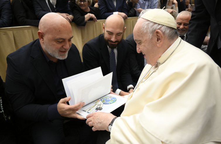 Papa Francesco ha ricevuto questa mattina nel corso dell’udienza generale Mauro Pallotta, in arte Maupal, lo street artist romano è diventato famoso per il murale del “Super Pope” realizzato nel 2014 e raffigurante il Papa nella classica posa di Superman con in mano la valigetta dei “Valores”. Da allora, Maupal ha prodotto numerosi altri murales che hanno come protagonista il Santo Padre, a cui questa mattina ha donato un’opera inedita realizzata appositamente in occasione dell’86esimo compleanno del Pontefice, il prossimo 17 dicembre.