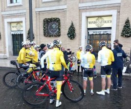 Partenza alle 9 da piazza San Pietro con un semplice momento insieme, nello stile di Athletica Vaticana: la Preghiera del ciclista, scaturita dall’esperienza spirituale del santuario della Madonna del Ghisallo, patrona dei “pedalatori” di tutto il mondo. Poi l’Ave Maria per il Papa e l’Ave Maria per la pace. Al simbolico “via” anche Alessia Trost a rilanciare il gemellaggio sportivo-solidale di Athletica Vaticana con le Fiamme Gialle, il gruppo sportivo della Guardia di Finanza: nel salto in alto è stata campionessa mondiale juniores e allieve. Dopo poche pedalate, davanti al cancello del Petriano, ecco l’abbraccio dei ciclisti – tra loro anche Rien Schurrhuis che a settembre ha corso i Campionati del mondo in Australia – con i volontari che stanno preparando la festa di Natale dei bambini e delle famiglie del Dispensario pediatrico “Santa Marta” che ci sarà domani mattina in Aula Paolo VI. “Due servizi che s’incrociano con lo stesso obiettivo, quasi un passaggio di testimone come in una staffetta solidale” dice Valentina Giacometti che collabora all’organizzazione della giornata per il Dispensario.