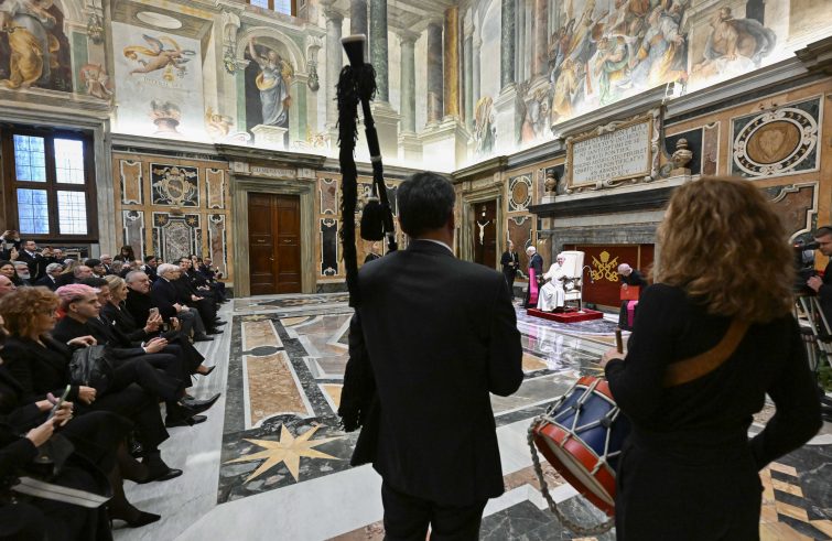 “La musica rasserena, dispone al dialogo, favorisce l’incontro e l’amicizia. In questo senso è una via aperta per la pace”. Così Papa Francesco nel corso dell’udienza di questa mattina agli artisti del “Concerto in Vaticano”, al Palazzo Apostolico. “Il messaggio che la Parola di Dio ogni anno ci rivolge nel tempo di Avvento – ha spiegato il Pontefice – non è un messaggio di rassegnazione o di tristezza, ma di speranza e di gioia, un messaggio da interiorizzare e da comunicare. E in questo ‘comunicare’ entrano in gioco anche la musica e il canto”. “La liturgia e le tradizioni popolari del Natale – ha proseguito Francesco – sono piene di musica e di canti. Lo stesso racconto evangelico ci parla dell’inno degli angeli: ‘Gloria a Dio nel più alto dei cieli e sulla terra pace agli uomini, che egli ama’ (Lc 2,14). Con il vostro canto, voi contribuite a diffondere questo messaggio di amore e di vita, arrivando a toccare tanti cuori e allargando il perimetro della fraternità”. “È così che Dio opera nella storia umana, anche in scenari dolorosi e desolati: con misericordia chiama tutti noi, si serve dei nostri talenti come dei nostri limiti, e vuole salvare l’umanità di oggi. Come a Natale, ogni giorno!”, ha assicurato il Papa. E ha concluso: “Il vostro talento è un dono ed è anche una responsabilità, di cui essere grati e consapevoli”.