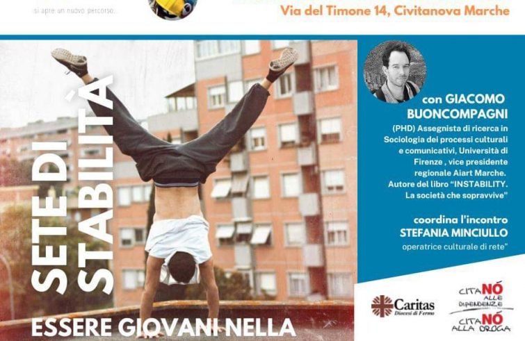 È in programma per domenica 4 dicembre, alle ore 17 nella parrocchia San Pietro di Civitanova Marche, l’incontro dal titolo “Sete di stabilità. Essere giovani nella società instabile”, organizzato dalla rete sociale “Oltre”, che partirà dalla presentazione del libro “Instability. La società che sopravvive” (Edizioni LaGru), di Giacomo Buoncompagni, assegnista di ricerca in Sociologia dei processi culturali e comunicativi all’Università di Firenze. “Si tratta di un appuntamento che ha come protagonisti i giovani, un evento che è stato voluto ed ideato proprio dai giovani e dove un giovane scrittore e ricercatore universitario, sarà protagonista. Ci piace questo impegno dei giovani. Come ricordato anche da Papa Francesco ‘i giovani sono speranza e futuro’ e proprio per questo diventa importante sostenere il protagonismo dei giovani”. Sono queste le parole di Barbara Moschettoni, direttrice della Caritas di Fermo, che presenta questo appuntamento come l’occasione per riflettere sull’idea di stabilità nella società contemporanea e come in questo scenario si inseriscono i giovani. Un momento di riflessione che, coordinata da Stefania Minciullo, operatrice culturale di rete, penderà spunto dal tema dei giovani affrontato nel libro, cercando il ruolo degli stessi nella società attuale, dove non ci si ferma spesso per riconoscere il valore delle relazioni e della cooperazione.