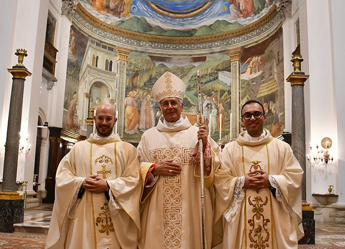 Si è svolta giovedì 8 dicembre, nel giorno della solennità dell’Immacolata Concezione, nella cattedrale di Spoleto, l’ordinazione presbiterale di Salvatore Ficarra e Luca Gentili, presieduta dall’arcivescovo, mons. Renato Boccardo. “Carissimi Luca e Salvatore compirete un passo che segnerà tutta la vostra vita. Per sempre. La Chiesa vi attende; gli uomini, vicini o lontani, vi aspettano ed hanno bisogno di voi. Come Gesù nel Vangelo, non potete rimandarli digiuni: hanno fame e sete di Dio, hanno bisogno della sua parola e del suo pane che salva. Andate loro incontro con cuore sereno e fiducioso: come servi, come amici, come ministri di Cristo e dispensatori dei suoi misteri”, ha detto il presule durante la celebrazione iniziata con la presentazione dei novelli sacerdoti da parte di don Andrea Andreozzi, rettore del Seminario regionale. “Il gesto di Luca e Salvatore conferma e corrobora la nostra fede, forse titubante e incerta, dà alla nostra speranza un palpito nuovo; il loro esempio, la loro gioia, la loro serenità sia testimonianza che ci scuote, perché questo evento non ci trovi soltanto spettatori, ma ci veda personalmente coinvolti nell’impegno della fedeltà alla vocazione battesimale”.