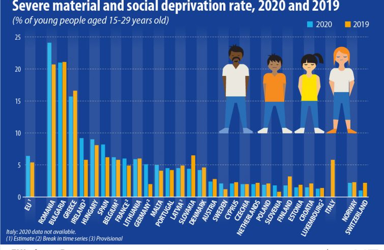 Cresce la percentuale di giovani tra i 15 e i 29 anni che vivono in uno stato di “grave deprivazione materiale e sociale”. Lo dice l’ufficio europeo di statistica Eurostat che oggi pubblica alcune statistiche relative al 2010-2020. Nel 2020 il 7% di giovani, il 2% in più rispetto all’anno precedente, viveva profonde difficoltà materiali e sociali. È lo stesso tasso registrato tra la popolazione totale. Tra gli Stati membri dell’Ue, la percentuale più alta di giovani gravemente svantaggiati socialmente e materialmente nel 2020 è stata registrata in Romania (24%), seguita da Bulgaria (21%) e Grecia (16%). Inferiore al 3% è la fetta di giovani svantaggiati in 11 dei 26 Stati membri (Lussemburgo, Croazia, Estonia, Finlandia, Slovenia, Polonia, Paesi Bassi, Repubblica Ceca, Cipro, Svezia e Austria). La povertà è aumentata soprattutto in Romania, Irlanda e Germania (tutti +3 punti percentuali) mentre si sono registrati lievi cali in Slovacchia (-2%), Finlandia, Grecia e Croazia (-1%). Quanto all’Italia, i dati del 2020 non sono stati resi disponibili, ma il dato del 2019 mostra che la percentuale di giovani in grave deprivazione fosse già al 7%.