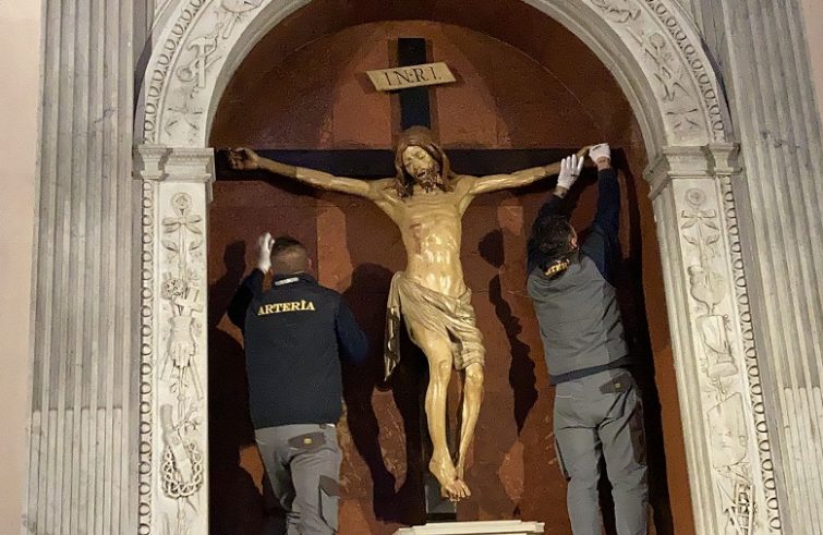 Dopo “La Madonna delle ciligie” del Sassetta e il “Giudizio universale” di Guido da Siena, esposti rispettivamente nella città del Palio e a Forlì per due grandi mostre su Dante, l’arte sacra grossetana continua ad attirare attenzione. Si sono concluse, infatti, nella tarda mattinata di oggi le operazioni di movimentazione del Crocifisso del Vecchietta, venerato nella cattedrale di San Lorenzo, a Grosseto. Prenderà la strada di Firenze, per la mostra “Donatello, ovvero il Rinascimento”, curata da Francesco Caglioti e prevista a Palazzo Strozzi e al Museo del Bargello dal 19 marzo al 31 luglio. A curare le delicate operazioni di movimentazione è stato il personale dell’azienda Arterìa, specializzata nella movimentazione, trasporto, esposizione e deposito di opere d’arte.