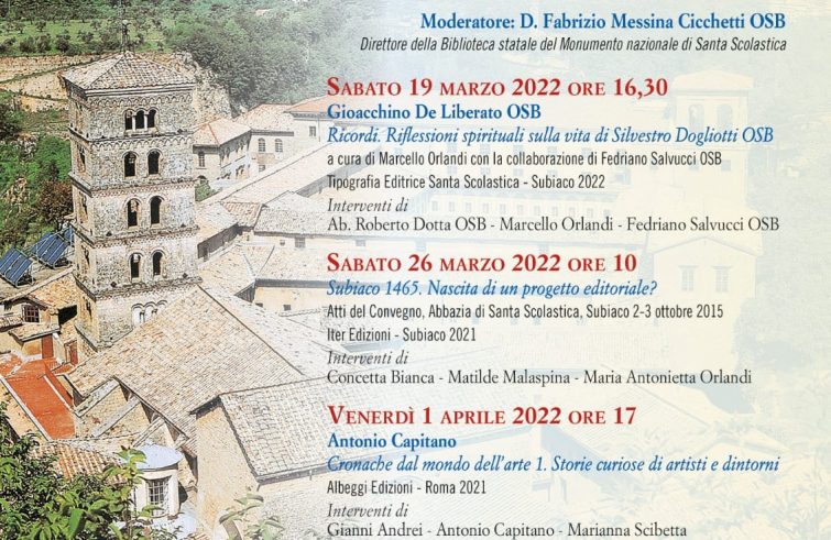 Partirà il prossimo 19 marzo il ciclo di presentazioni di libri organizzato dalla Biblioteca statale del Monumento nazionale di Santa Scolastica, a Subiaco (Rm). A moderare gli incontri il direttore della Biblioteca, il benedettino dom Fabrizio Messina Cicchetti. Il primo incontro è dedicato al testo di dom Gioacchino De Liberato “Ricordi. Riflessioni spirituali sulla vita di Silvestro Dogliotti”. Il calendario prevede il 26 marzo la presentazione degli atti del convegno “Subiaco 1465. Nascita di un progetto editoriale?”, il 1 aprile “Cronache dal mondo dell’arte 1. Storie curiose di artisti e dintorni” e sabato 2 aprile (ore 17) “Tra due famiglie” di Gholam Najafi, scrittore e rifugiato afghano, fuggito dal suo Paese a soli 10 anni, nel 2000. Suo padre, pastore, è stato ucciso dai talebani. La partecipazione sarà in presenza (prenotazione obbligatoria a: bmn-sns.comunicazione@beniculturali.it indicando la data dell’evento prescelto) e on line sul canale You Tube della biblioteca.