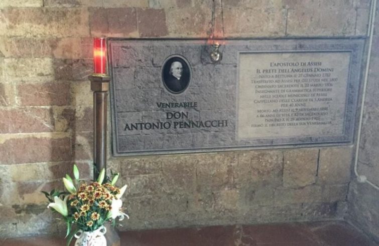 Don Antonio Pennacchi è nato a Bettona il 27 gennaio 1782 ed è morto nel 1848. Visse ad Assisi, nella parrocchia di San Pietro. Si sentì chiamato dal Signore alla vocazione sacerdotale e a 18 anni, all’inizio del 1800 si trasferì in Assisi per continuare gli studi filosofici e teologici. Si distinse subito per la sua intelligenza, per il suo impegno e per la pietà. Fu ordinato sacerdote il 22 marzo 1806 dal vescovo Francesco Maria Giampé che, per la sua grande cultura, lo nominò insegnante di grammatica superiore nelle scuole municipali di Assisi e cappellano nella chiesa abbaziale di San Pietro e delle suore clarisse francescane di Sant’Andrea. Il fondamento della sua spiritualità sarà il mistero dell’Annunciazione e dell’Incarnazione del Figlio di Dio e per tutta la sua vita sarà l’apostolo dei nomi di Gesù e Maria. Da qui nascerà il suo amore alla povertà, alla preghiera, all’umiltà e penitenza sull’esempio di San Francesco. La causa di beatificazione, aperta all’inizio del ‘900, per contingenze storiche, non ebbe seguito e solo nel giugno del 2016 è stata riavviata con un decreto del vescovo Sorrentino. Il 14 marzo 2019 si è chiusa la fase diocesana del processo di beatificazione e canonizzazione del venerabile ed è iniziata così la seconda fase.