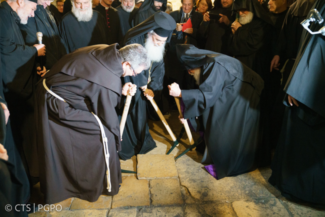 Si è svolta ieri, 14 marzo, presso la Basilica del Santo Sepolcro, la cerimonia di avvio del progetto per la conservazione e il restauro del pavimento alla presenza del Patriarca Greco-Ortodosso Teophilo III, il Custode di Terra Santa padre Francesco Patton, e il Gran Sacrestano del Patriarcato Armeno Arch. SevanGharibian, in rappresentanza del Patriarca NourhanManougian. Questi lavori, riferisce la Custodia di Terra Santa, a prosecuzione del restauro dell’Edicola della Tomba di Cristo effettuati tra il 2016/2017 a cura del Patriarcato Greco-Ortodosso, sono curati dalla Custodia di Terra Santa in collaborazione con l’Università “la Sapienza” di Roma, il Centro per la Conservazione e Restauro “La Venaria Reale”, il Politecnico di Milano, la ditta Manens di Padova e la ditta IG Ingegneria Geotecnica di Torino. In particolare, questa fase di lavori prevede non solo la progettazione e realizzazione del restauro della pavimentazione dell’intera Basilica del Santo Sepolcro, ma anche eventuali interventi di messa in sicurezza dell’Edicola, oltre che un’attenzione agli impianti elettrici, idrici, meccanici, speciali, antincendio. “Il restauro dell’Edicola – ha detto Teophilo III – è segno di speranza per il mondo. Siamo profondamente grati a tutti gli esperti che hanno reso possibile tutto questo e siamo convinti che questo porterà a un’ottima realizzazione del progetto di restauro della Rotonda dell’Anastasis iniziato anni fa, e del resto della pavimentazione della Basilica”. “Questo progetto comune è stato iniziato già due anni fa, e tutto era pronto per l’inizio reale dei lavori” ha ricordato il Custode di Terra Santa. “La pandemia ha rallentato la possibilità di muoverci dal progetto all’esecuzione, ma ora siamo pronti ad iniziare. In questo contesto storico, con la pandemia e la guerra, la cooperazione ai lavori di restauro assume un significato diverso, perché questo è il luogo in cui Gesù diventa pietra angolare della Chiesa”. In ultimo, anche l’arcivescovo SevanGharibian ha ringraziato i presenti, sottolineando il suo entusiasmo per l’unione nei lavori di restauro. A seguire, i rappresentanti delle tre comunità e degli enti coinvolti si sono spostati verso il corridoio antistante la Sacrestia dei Francescani – da cui inizieranno i lavori – per il sollevamento della prima pietra.