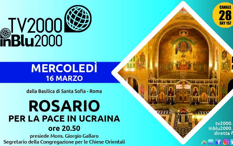Torna l’appuntamento con “Prega con noi”. Tv2000 e InBlu2000 invitano i fedeli, le famiglie e le comunità religiose a ritrovarsi oggi, mercoledì 16 marzo alle 20.50, per recitare insieme il Rosario per la pace in Ucraina trasmesso su Tv2000 (canale 28, e 157 Sky) e InBlu2000, oltre che su Facebook e dedicato in particolare alle vittime innocenti della guerra, agli anziani, alle mamme e ai bambini sotto le bombe o in fuga dalle loro case. La preghiera sarà trasmessa dalla basilica di Santa Sofia, chiesa nazionale degli ucraini a Roma, con mons. Giorgio Gallaro, segretario della Congregazione per le Chiese orientali.
