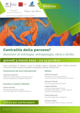 “Centralità della persona? Questioni di ontologia, antropologia, etica e diritto” è il tema al centro del webinar che si terrà giovedì 3 marzo, dalle ore 14.30 alle 18, promosso dal dipartimento di Scienze umane dell’Università degli studi “Guglielmo Marconi” in collaborazione con “Persona al centro. Associazione per la filosofia della persona”, l’Università degli studi di Teramo, il Cespec (Centro studi sul pensiero contemporaneo) e la Fondazione Luigi Stefanini. I lavori saranno aperti da Tommaso Valentini, direttore del dipartimento di Scienze umane dell’Università “Guglielmo Marconi”, e da Andrea Gentile, preside della facoltà di Lettere dello stesso ateneo. Seguiranno le relazioni di Vittorio Possenti, presidente di “Persona al centro; Giovanni Franchi (Università di Teramo); Angela Michelis, presidente Cespec; Vinicio Busacchi (Università di Cagliari); e Damiano Bondi (Università di Urbino “Carlo Bo”). L’incontro – trasmesso in diretta streaming su zoom (https://bit.ly/3v9CmHp) – sarà anche l’occasione per presentare “Persona centralità e prospettive” (ed. Mimesis), il nuovo volume dell’associazione “Persona al centro” curato da Claudio Ciancio, Giuseppe Goisis, Vittorio Possenti e Francesco Totaro. Il libro, spiega un comunicato, “che integra 20 contributi di studiosi italiani di indirizzo personalistico, affronta tematiche in cui la persona è centrale nell’incessante controversia sull’humanum tipica della nostra epoca”.