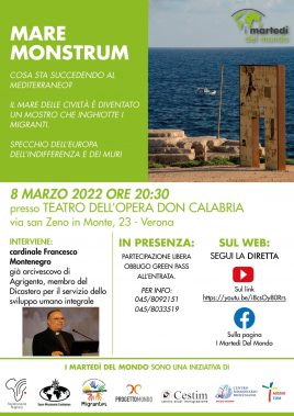 “Mare Monstrum” è il titolo dell’incontro con il cardinale Francesco Montenegro, già arcivescovo di Agrigento, membro del Dicastero per il Servizio dello sviluppo umano integrale, che si svolgerà martedì 8 marzo alle ore 20.30 il teatro dell’Opera don Calabria a Verona (via san Zeno in Monte 23, Verona) e in diretta youtube sul canale dei Martedì del mondo. L’evento è promosso da Fondazione Nigrizia, Centro missionario diocesano, Cestim, ProgettoMondo, Centro pastorale immigrati, Missio Cum, Missionarie comboniane Italia e fa parte del ciclo di incontri e dibattiti su temi di attualità dei Martedì del mondo. Sono infatti 1.864 le persone morte nel mar Mediterraneo lo scorso anno, un numero sicuramente sottostimato. Il Mediterraneo, affermano i promotori, è “diventato un mostro che inghiotte le persone migranti che tentano di attraversarlo”, “specchio di un’Europa, continente dell’indifferenza, dei muri e dell’ipocrisia, capace di accogliere solo quando chi migra appartiene a confini più vicini, a volti più bianchi”.