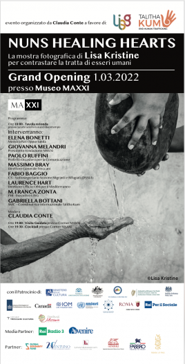 È stata inaugurata ieri pomeriggio al Museo Maxxi a Roma  (sala Graziella Lonardi Buontempo) la mostra fotografica “Nuns healing hearts” di Lisa Kristine contro la tratta di persone. La mostra è organizzata dall’imprenditore culturale Claudia Conte in collaborazione con il Global solidarity fund a favore dell’Unione internazionale delle superiori generali e di Talitha Kum. Dopo l’inaugurazione in Vaticano con Papa Francesco e l’esposizione presso il Palazzo delle Nazioni Unite a New York, “Nuns healing hearts” sarà per la prima volta aperta al pubblico italiano, gratuitamente, presso il Corner Maxxi dal 1° al 6 marzo, dalle ore 11 alle ore 19. Gli scatti della fotografa umanitaria Lisa Kristine “nascono da un dialogo profondo tra l’artista, le suore e le vittime della tratta”, spiegano i promotori, e raccontano l’impegno della rete internazionale “Talitha Kum” che conta la partecipazione di oltre 3000 suore, amici e partner in tutto il mondo. Coordina 50 reti in oltre 90 Paesi. Nel 2020, Talitha Kum si è presa cura di oltre 15.000 sopravvissute e circa 170.000 persone hanno beneficiato di attività di prevenzione e formazione contro la tratta. All’inaugurazione hanno partecipato, tra gli altri, suor Gabriella Bottani, coordinatrice internazionale Talitha Kum, Paolo Ruffini, prefetto del Dicastero per la Comunicazione della Santa Sede, padre Fabio Baggio, sottosegretario Sezione Migranti e Rifugiati. Durante la tavola rotonda sono stati proiettati il videomessaggio della fotografa Lisa Kristine e il video di Talitha Kum “Che cos’è la tratta di persone?”, diretto da Lia Beltrami. Hanno patrocinato il progetto numerose istituzioni: Ministero della Cultura, Ambasciata presso la Santa Sede degli Stati Uniti, Regno Unito, Australia, Canada, Irlanda, Paesi Bassi, Fondazione pontificia Gravissimum Educationis, Galileo Foundation, Iom, Unicr, assessorato alla Cultura di Roma Capitale, Rai per il Sociale, Fondazione Treccani Cultura, Festival della Missione.