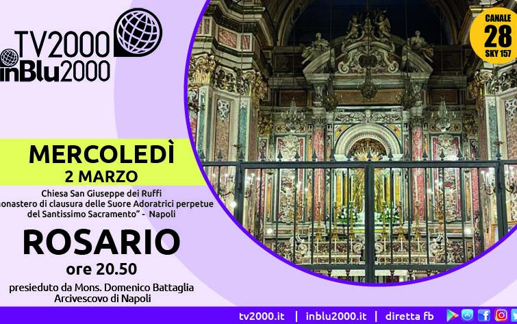 Torna l’appuntamento con “Prega con noi”. Tv2000 e InBlu2000, in occasione del Mercoledì delle Ceneri, invitano i fedeli, le famiglie e le comunità religiose a ritrovarsi oggi, mercoledì 2 marzo alle 20.50, per recitare insieme il Rosario trasmesso su Tv2000 (canale 28 e 157 Sky) e InBlu2000, oltre che su Facebook. La preghiera sarà trasmessa dalla chiesa San Giuseppe dei Ruffi “Monastero di clausura delle Suore Adoratrici perpetue del Santissimo Sacramento” a Napoli, con mons. Domenico Battaglia, arcivescovo di Napoli.