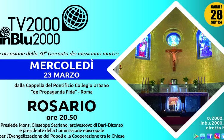 Ritorna la recita del rosario su Tv2000 con “Prega con noi”, stavolta in occasione della trentesima Giornata dei missionari martiri (24 marzo 2022). I fedeli, le famiglie e le comunità religiose sono invitate a ritrovarsi domani, mercoledì 23 marzo, alle 20.50, per recitare insieme il Rosario trasmesso su Tv2000 (canale 28 e 157 Sky), InBlu2000, e su Facebook.