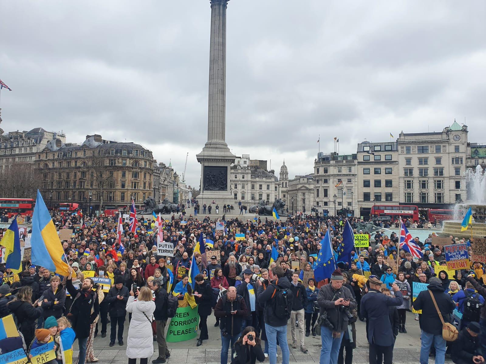 I manifestanti – ne erano attesi quindicimila in arrivo da tutta l’Inghilterra – hanno cantato l’inno nazionale ucraino e portavano dei cartelli con le scritte “Putin uccide”, “Putin è colpevole di crimini di guerra” e anche uno striscione che diceva: “Quando l’ultimo soldato ucraino sarà morto, Putin si dirigerà verso di voi, signore e signori”. Nella più importante piazza londinese sono arrivati, da diverse città inglesi, membri di “Euro-Maidan”, l’associazione che nel 2013 protestò contro l’allora presidente in carica V. Janukovič che decise di non sottoscrivere il trattato di associazione politica ed economica con l’Ue, orientando il Paese in senso filorusso, dell’“Associazione degli ucraini in Gran Bretagna”, dell’“Organizzazione delle donne ucraine nel Regno Unito” e della Chiesa greco cattolico ucraina e delle Chiese ortodosse ucraine del Regno Unito dove vivono circa settantamila cittadini ucraini.