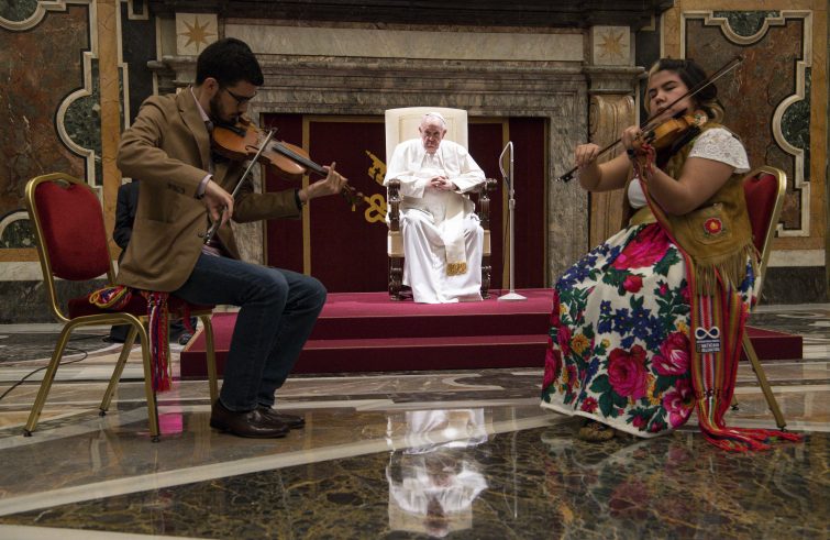 Il suono dei tamburi, la musica del violino, i canti e le danze tipiche di loro popoli. Ciascuna delle tre delegazioni First Nations, Métis e Inuit ha offerto questa mattina a Papa Francesco un’espressione culturale e cerimoniale per “consentire – si legge in una nota data ai media dalla conferenza episcopale canadese – sia al Santo Padre che al pubblico presente un’opportunità per apprezzare più pienamente la cultura e la cerimonia indigena tradizionale”. David Serkoak, batterista inuit, ha eseguito una esibizione del tamburo inuit usata per celebrare occasioni particolari come la prima caccia di un ragazzo o la nascita di un bambino. Alexander John Lamoureux e Brianna Marie Lizotte dei Métis hanno invece eseguito une esecuzione in violino, strumento particolarmente amato dai Métis che iniziarono a suonare adattando alla loro cultura ancestrale le melodie scozzesi, irlandesi e francesi. Infine le Prime Nazioni hanno eseguito una danza tradizionale. L’udienza si è conclusa con uno scambio di doni. Papa Francesco ha donato ad ogni singola delegazione un ramo di olivo in bronzo, in “segno di pace e di riconciliazione”.