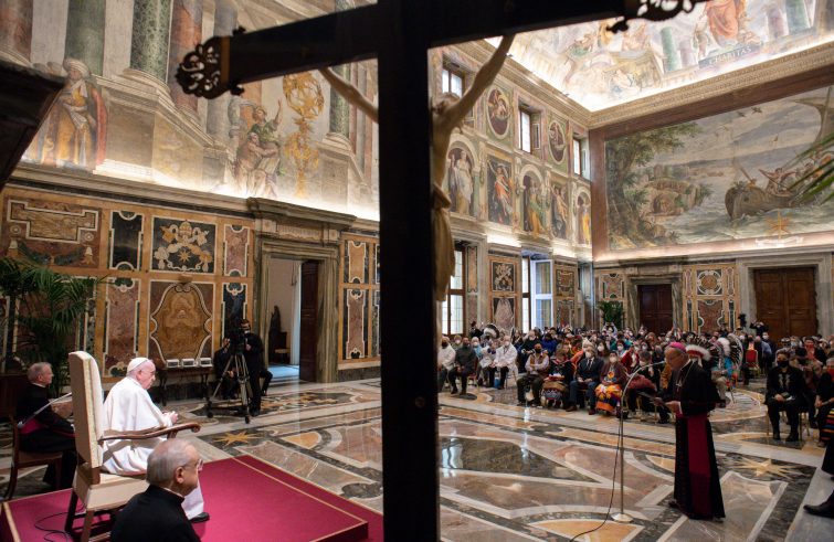 “Santo Padre, la nostra storia recente è segnata dall’infamia degli errori e dei fallimenti nell’amare il prossimo, in particolare verso i membri di quelle nazioni che da secoli erano presenti in Canada. Il nostro desiderio di riconciliazione è grande e la nostra presenza qui è una testimonianza del nostro impegno”. Con queste parole mons. Raymond Poisson, vescovo di Saint-Jérôme and of Mont-Laurier e president dei vescovi canadesi, ha aperto l’udienza oggi nella Sala Clementina di Papa Francesco con un gruppo di delegati dei popoli nativi del Canada, Métis, Inuit e First Nations. “Siamo quindi venuti da lei, Santo Padre, popolo d’America – di First Nations, Métis e Inuit, come pure discendenti europei e tanti altri – per imparare da lei ciò che è più gradito a Dio in modo da metterlo in atto nel nostro cammino insieme di riconciliazione. Santo Padre, la sua calorosa accoglienza come pastore della Chiesa universale, è particolarmente importante per tutti i canadesi in questo cammino di riconciliazione. Le sue parole, cariche di appelli alla misericordia e richiami alla tenerezza di Dio, ci incoraggiano nella nostra opera di riconciliazione”. Mons. Poisson ricorda che Papa Francesco si è detto disponibile ad accogliere l’invito dell’episcopato del Paese nordamericano, a visitare il Canada. Sebbene le date della visita saranno ufficializzate prossimamente, il presidente dei vescovi cattolici oggi ha detto: “La vostra risposta positiva all’invito dei vostri figli e fratelli Vescovi del Canada a visitare il nostro Paese scalda il cuore dei fedeli canadesi. È quasi come se fossimo pronti oggi ad aiutarti a fare le valigie!”.