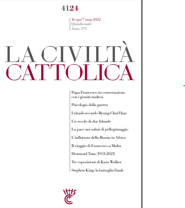 “La recente invasione dell’Ucraina da parte della Russia ha risvegliato nell’Occidente antiche paure e l’ha costretto a confrontarsi con una problematica che riteneva essersi lasciata definitivamente alle spalle. La guerra mostra uno dei tanti aspetti paradossali dell’essere umano, l’unico tra le specie viventi a intraprendere questa attività del tutto irrazionale”. Esordisce così p. Giovanni Cucci, scrittore de La Civiltà Cattolica, dalle colonne del numero 4.124 della rivista in uscita sabato e com di consueto anticipato al Sir. La guerra, prosegue, “è infatti essenzialmente devastatrice: chi vi partecipa mette a rischio il suo bene più grande, la vita, provoca povertà, distrugge nazioni, porta malattie, ferite e traumi che durano per molti anni anche dopo la sua fine. Eppure essa è attestata fin dagli albori della vita umana, e non esiste periodo in cui si registri la sua totale assenza. È sintomatico che la stessa storia, sia sacra sia profana, venga fatta iniziare con un fratricidio”.