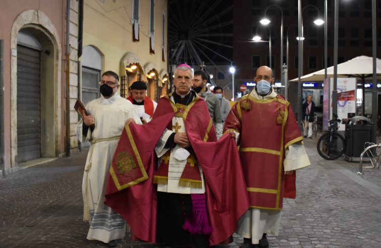 Il vescovo ha ricordato come il momento della celebrazione del Venerdì Santo con la processione cittadina del Cristo morto e della Madonna Addolorata dia testimonianza dell’amore di Gesù, specie in questo particolare momento: “Gesù è stato obbediente all’amore che ci è stato donato, preghiamo questa sera per tutte le disobbedienze all’amore che ancora oggi vengono per perpetrate con violenza fratricida, attraverso la guerra, ma anche attraverso le piccole grandi divisioni che esistono tra di noi e nelle nostre famiglie”.