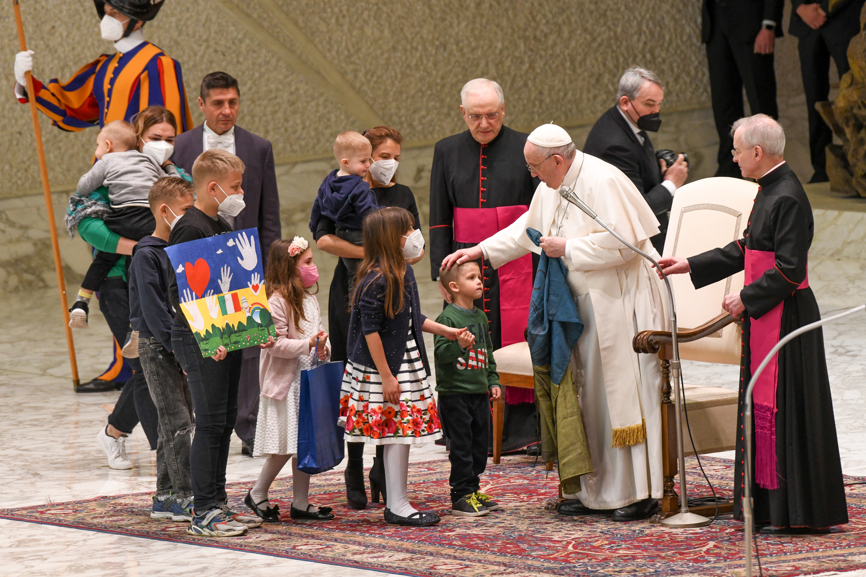 Papa Francesco: udienza, “nuove atrocità sulla guerra in Ucraina, come il massacro di Bucha”. “Si metta fine a questa guerra, si facciano tacere le armi”. Mostra una bandiera proveniente da Bucha e fa salire sul palco i bambini ucraini. “Non dimentichiamo il popolo ucraino”