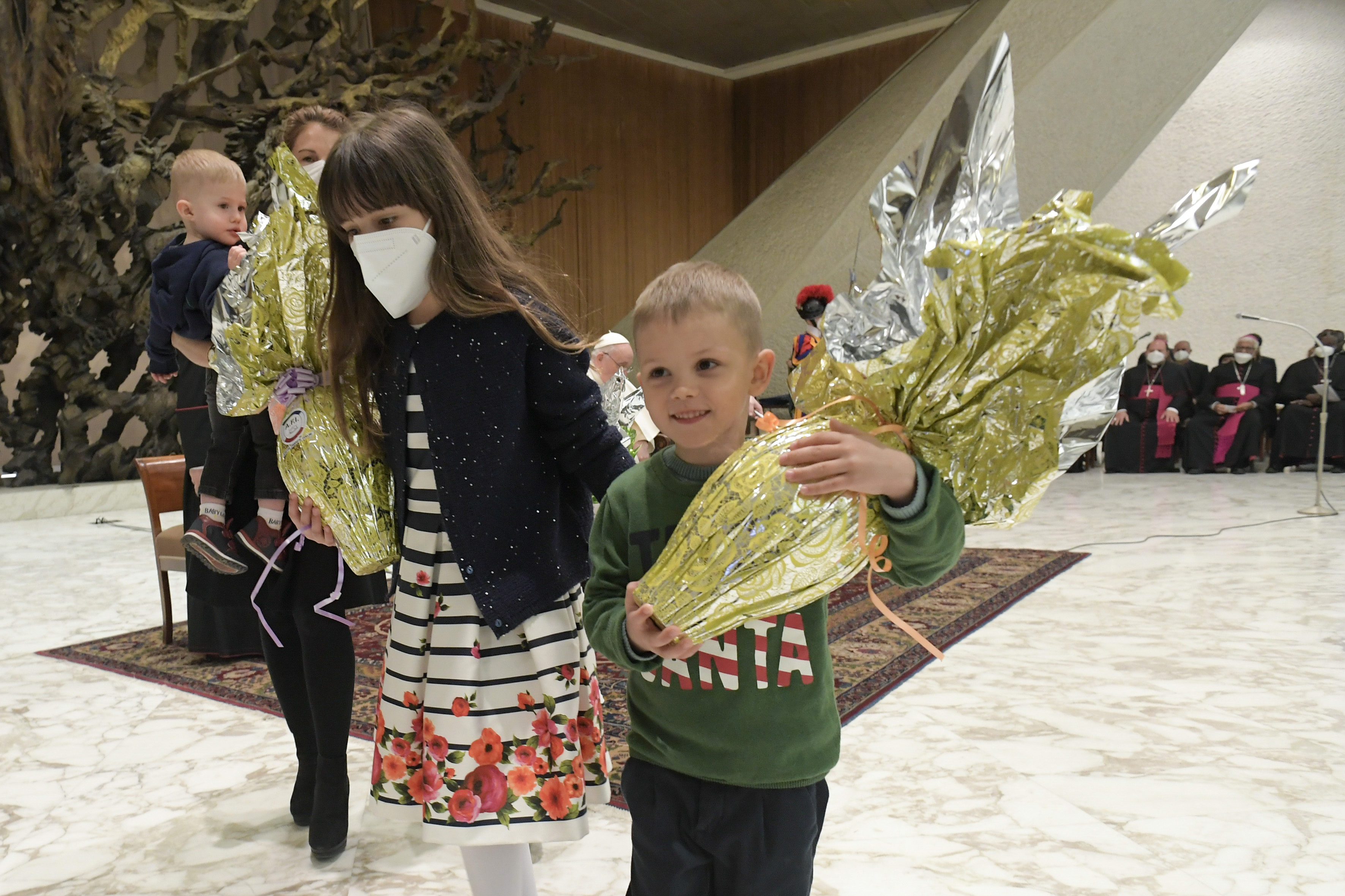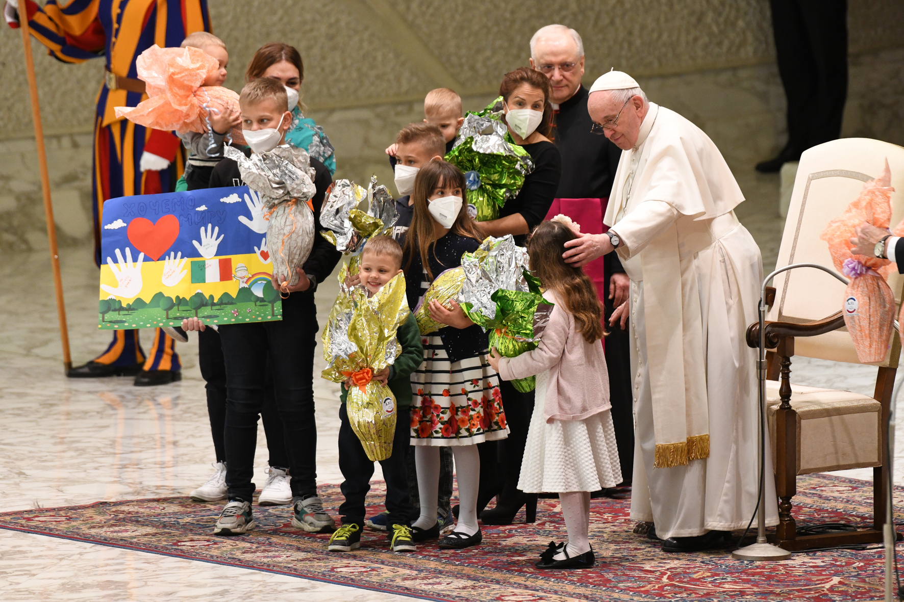 “Le recenti notizie sulla guerra in Ucraina, anziché portare sollievo e speranza, attestano invece nuove atrocità, come il massacro di Bucha”. A denunciarlo è stato il Papa, al termine dell’udienza di oggi, prima dei saluti in lingua italiana. “Crudeltà sempre più orrende compiute anche contro civili, donne e bambini inermi”, ha proseguito Francesco: “Sono vittime il cui sangue innocente grida fino al cielo e implora: si metta fine a questa guerra, si facciano tacere le armi, si smetta di seminare morte e distruzione”. “Preghiamo insieme su questo”, l’invito del Papa ai presenti in Aula Paolo VI, che hanno pregato insieme a lui qualche minuto in silenzio. “E ieri, proprio da Bucha, mi hanno portato questa bandiera”, ha rivelato Francesco, che si è alzato in piedi per dispiegarla e farla vedere a tutti. “Questa bandiera viene dalla guerra. Proprio da quella città martoriata, Bucha”, ha spiegato: “E anche qui ci sono qui alcuni bambini ucraini che ci accompagnano. Salutiamoli e preghiamo insieme con loro”. “Questi bambini sono dovuti fuggire e arrivare a una terra strana”, ha detto il Papa una volta attorniato sul palco dai piccoli: “Questo è uno dei frutti della guerra, non dimentichiamolo. E non dimentichiamo il popolo ucraino”. Poi il Santo Padre ha distribuito uova di Pasqua ai bambini, e ha commentato: “È duro essere sradicato dalla propria terra per una guerra”.