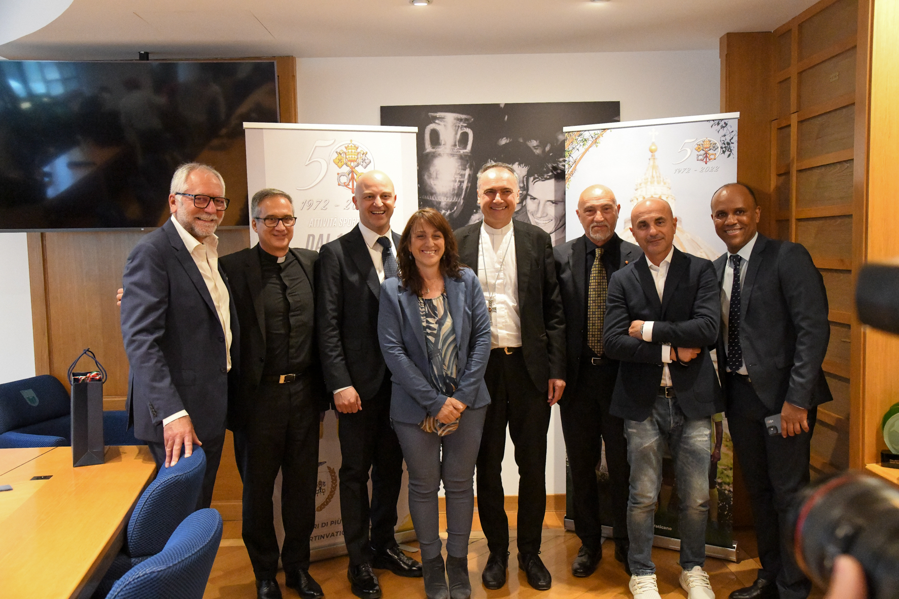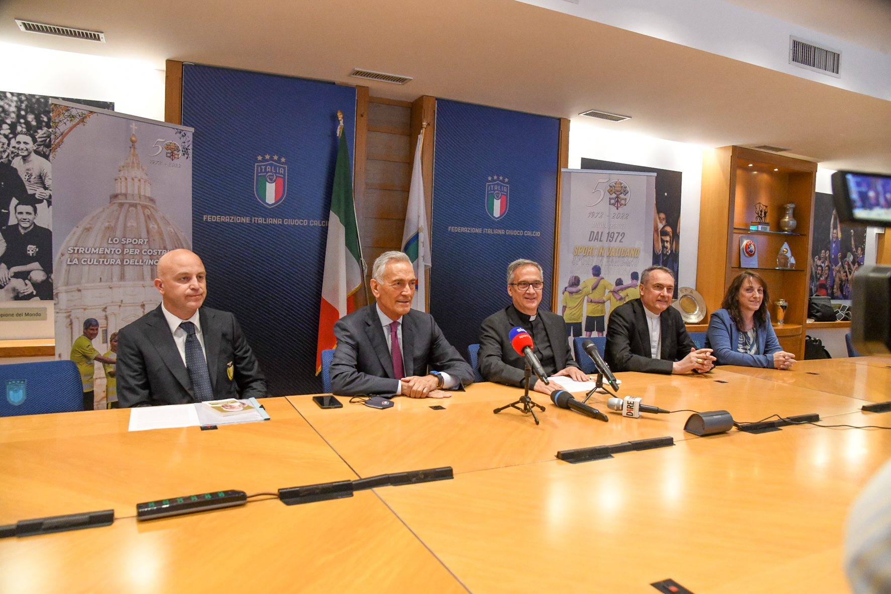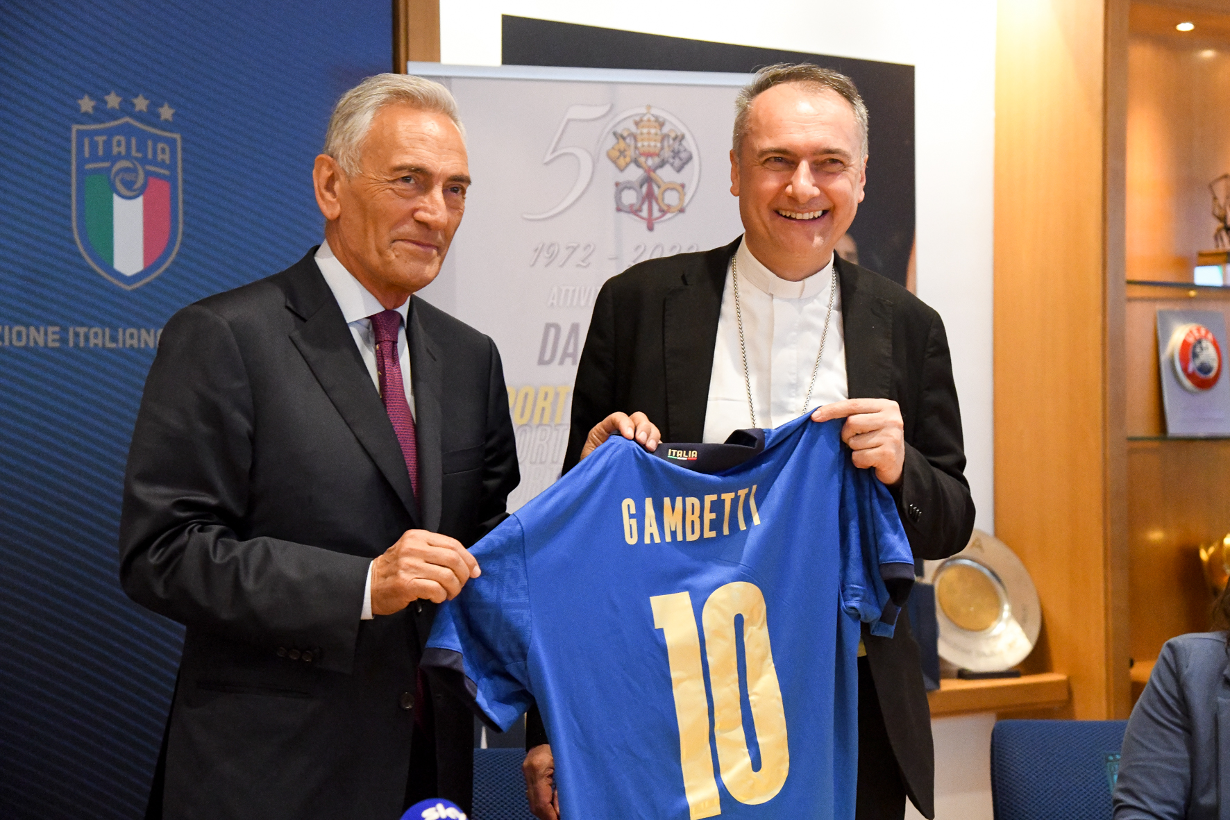 Si è svolta questa mattina a Roma, nella sala Paolo Rossi della Figc, la conferenza stampa di presentazione della maglia commemorativa per l’anniversario dei 50 anni dell’Associazione Asd Sport in Vaticano, che ha visto la partecipazione del card. Mauro Gambetti, Vicario generale di Sua Santità per la Città del Vaticano, Nicola Vignola e Susan Volpini, rispettivamente vicepresidente e Team manager dell’Asd Sport in Vaticano, oltre che il presidente della Figc Gabriele Gravina e mons. Dario Viganò. Un momento dai toni anche scherzosi, con battute sull’esclusione di un ragazzo dal campionato vaticano per una frase blasfema, così come sulla classifica “fair play” che si somma a quella definitiva, o la proposta di concedere la Var per far aumentare le discussioni anche nello stato pontificio, ma anche sull’ipotesi rimbalzata tra le parti, di comprendere il Vaticano nell’Uefa, lanciata già in passato in occasione dell’udienza di Papa Francesco ad Aleksander Čeferin, presidente Uefa, alla vigilia delle fasi finali degli Europei vinti dall’Italia. “Forse dovevamo, prima delle eliminatorie, dovevamo tornare da Sua Santità per una benedizione speciale. Ne faremo ammenda”, le parole di Gravina che si è complimentato per la missione portata avanti dall’associazione sportiva vaticana, dai valori originali del gioco del calcio e dello sport in genere, in controtendenza con la deriva economica che condiziona i diversi settori.