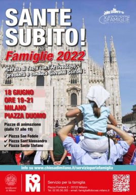Come noto, dal 22 al 26 giugno si svolgerà a Roma il decimo Incontro mondiale delle famiglie: “Seguendo le indicazioni di Papa Francesco e tenendo conto delle restrizioni legate alla pandemia, l’evento vedrà però la partecipazione solo di piccole delegazioni di ogni Paese, mentre tutte le diocesi del mondo sono state invitate a promuovere iniziative locali nei giorni precedenti”, si legge in un comunicato della diocesi di Milano. Nella diocesi ambrosiana si terrà sabato 18 giugno dalle 19, in piazza Duomo, l’evento “Sante subito! Famiglie 2022”: un “incontro di due ore, aperto a tutti, in compagnia dell’arcivescovo, mons. Mario Delpini, per riflettere, pregare e fare festa per e con le famiglie. A condurre la serata sarà l’attore Giovanni Scifoni, volto noto al grande pubblico”.