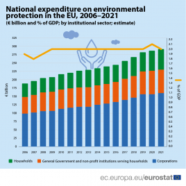 Eurostat stima che, nel 2021, la gestione dei rifiuti e il trattamento delle acque reflue hanno rappresentato il 28% e il 23% della spesa totale nelle amministrazioni pubbliche e nel settore non profit. I dati mostrano che il 24% della spesa totale è andato alla ricerca e sviluppo ambientale e ad altre attività di protezione ambientale, compresa l’amministrazione e l’istruzione ambientale generale, il 13% alla protezione della biodiversità e del paesaggio e il restante 11% alla protezione dell’aria, del suolo e delle acque sotterranee, riduzione del rumore e protezione contro le radiazioni.