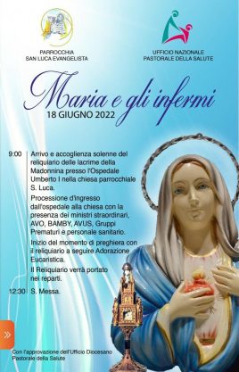 Il reliquiario della Madonna delle Lacrime all’ospedale Umberto I a Siracusa. L’iniziativa, denominata “Maria e gli Infermi”, è in corso stamattina su iniziativa della parrocchia San Luca evangelista e dell’Ufficio diocesano per la Pastorale della salute diretto da don Raffaele Aprile. Dopo l’arrivo e l’accoglienza, all’interno dell’ospedale siracusano, del reliquiario che custodisce le lacrime della Madonnina nella chiesa parrocchiale San Luca, è prevista una processione d’ingresso con la presenza dei ministri straordinari, dei volontari dell’Avo, dell’Avulss, dei Gruppi prematuri e del personale sanitario. Dopo un momento di preghiera con il reliquiario seguirà l’adorazione eucaristica. Alle 12.30 sarà celebrata la messa.