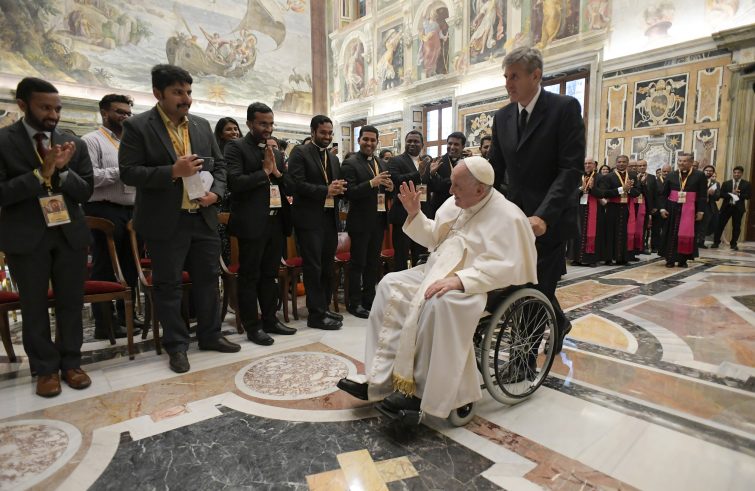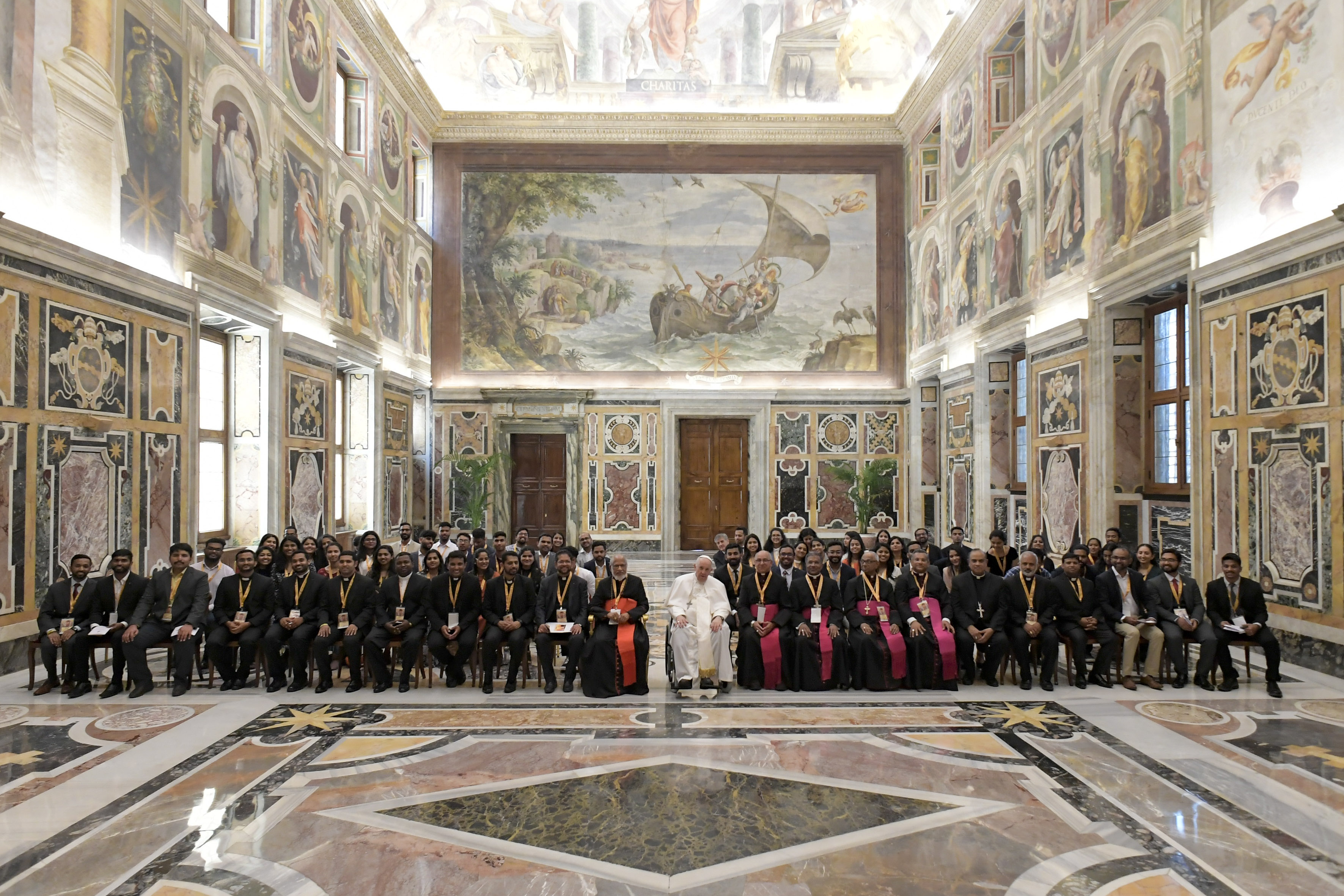“In ogni pellegrinaggio è anzitutto il Signore Gesù che noi cerchiamo, Lui che è la via, la verità e la vita. Vogliamo seguirlo e percorrere il suo cammino, quello dell’amore, l’unica via che conduce alla vita eterna. Non è una strada comoda, ma è affascinante, e Lui non ci abbandona mai, mai ci lascia soli. Se gli facciamo spazio nella nostra esistenza, condividendo con Lui gioie e dolori, sperimenteremo la pace che solo Dio può dare”. Con queste parole Papa Francesco ha dato il benvenuto ai partecipanti alla Syro-Malabar Youth Leaders Conference, ricevuti in udienza nel Palazzo apostolico vaticano, accompagnati da mons. Bosco Puthur, ricordando, ai leader giovanili delle varie eparchie siro-malabaresi della diaspora e della Visitazione apostolica in Europa, come Gesù non abbia esitato a chiedere ai suoi discepoli se volevano veramente seguirlo o se preferivano prendere un’altra strada. “Anch’io oggi, in un tempo segnato dalla cultura ‘liquida’ o addirittura ‘gassosa’, dico a voi, cari giovani, che la vita diventa piena di senso e feconda quando diciamo ‘sì’ a Gesù”. Bergoglio ha richiamato alle domande esistenziali di ognuno, sottolineando l’importanza di un’esperienza che dà senso a tutta la vita, dicendo sì al servizio e alla responsabilità e no alla superficialità e allo scarto, ricordando il martirio di Tommaso di cui ricorrono i 1950 anni come testimonianza di una Chiesa apostolica. “Ogni battezzato partecipa alla sua costruzione nella misura in cui lui o lei è testimone. E voi siete chiamati a esserlo in primo luogo tra i vostri coetanei della diaspora siro-malabarese, ma anche a quanti non appartengono alla vostra comunità e a quelli che nemmeno conoscono il Signore Gesù”. Papa Francesco ha esortato i giovani a non avere paura dell’amore di Gesù, ispirandosi alle testimonianze d’amore dei santi e delle sante di ogni epoca, anche contemporanea. “Non temete di ribellarvi alla tendenza diffusa a ridurre l’amore a qualcosa di banale, senza bellezza, senza comunione, senza fedeltà e responsabilità. Questo è ciò che accade quando usiamo gli altri per i nostri scopi egoistici, come oggetti: i cuori sono spezzati e rimane la tristezza”.