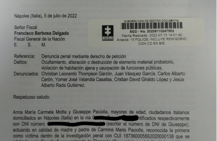 Queste 15 pagine di denuncia non si limitano ai funzionari delle Nazioni Unite ma anche segnalano la complicità di 4 agenti di polizia: Carlos Alberto Cerón, Yomer José Velandia Casallas, Cristian David Giraldo López y Jesús Alberto Rada Gutiérrez.