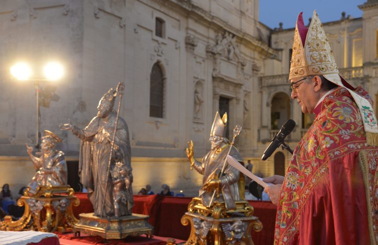 La diocesi di Lecce si prepara a vivere la festa patronale in onore di sant’Oronzo, san Giusto e san Fortunato, e la chiusura del Giubileo Oronziano per i 2000 anni dalla nascita del patrono della città e della diocesi, con una serie di appuntamenti religiosi e culturali programmati dalla Curia in collaborazione con ArtWork, la cooperativa che opera al progetto LeccEcclesiae per la cura e la fruizione turistica del patrimonio ecclesiastico diocesano. Il 15 agosto inizia in cattedrale l’Undena in onore dei santi patroni: messa e predicazione ogni sera alle ore 19. Il 18 agosto, alle ore 20,30 nel duomo, “Le sonorità ricercate”, concerto di Antonio Rizzato (organo) e Giuseppe Spedicati (fagotto). Il 22 agosto, alle ore 20 nel chiostro dell’antico seminario, la presentazione della nuova ristampa anastatica dell’opera Lecce Sacra di Giulio Cesare Infantino a cura di Mario Cazzato. Il 23 agosto, alle ore 19,30 nel chiostro del seminario, l’inaugurazione della mostra fotografica di Bruno Barillari sulle chiese del circuito LeccEcclesiae, che resterà aperta fino al 30 settembre. Il 24 agosto, l’amministrazione comunale presieduta dal sindaco ed accompagnata dalla banda, la mattina compirà il tradizionale saluto al vescovo in piazza Duomo, aprendo ufficialmente i 3 giorni di festa. Alle ore 19, sempre in piazza Duomo, mons. Michele Seccia presiederà un momento di preghiera comunitaria prima della partenza della processione per le vie del centro di Lecce, ed al rientro il consueto messaggio alla città. Il 25 agosto, alle ore 10 nel santuario di Sant’Oronzo fuori le mura, la messa presieduta dal vescovo di Lecce con al termine la chiusura della Porta Santa. Alle ore 19 in cattedrale, la messa della vigilia della festa patronale, con l’offerta dell’olio che alimenta la lampada votiva dell’altare di Sant’Oronzo in cattedrale, da parte dei sindaci dei comuni della Vicaria di Vernole. Alle ore 20,30, nel chiostro del seminario, il reading teatrale scritto da Maria Francesca Mariano dal titolo “Laudato si’, Il creato parla e il potere si racconta”. Il 26 agosto per tutta la giornata, su iniziativa di Poste Italiane, sarà possibile effettuare l’annullo filatelico in occasione della chiusura del Giubileo Oronziano. Alle ore 19 in piazza Duomo, il solenne pontificale presieduto da mons. Zelimir Puljic, arcivescovo di Zara città dove è venerata la reliquia di Sant’Oronzo, ed al termine la chiusura della Porta Santa della cattedrale. Il 27 agosto alle ore 19, in duomo, la messa di ringraziamento. Il 7 settembre, alle ore 20,30 in cattedrale, alla vigilia del 25mo anno di episcopato di mons. Michele Seccia, Sabino Manzo dirige il concerto dell’Orchestra barocca Santa Teresa dei Maschi e dell’Ensemble vocale Florilegium vocis.