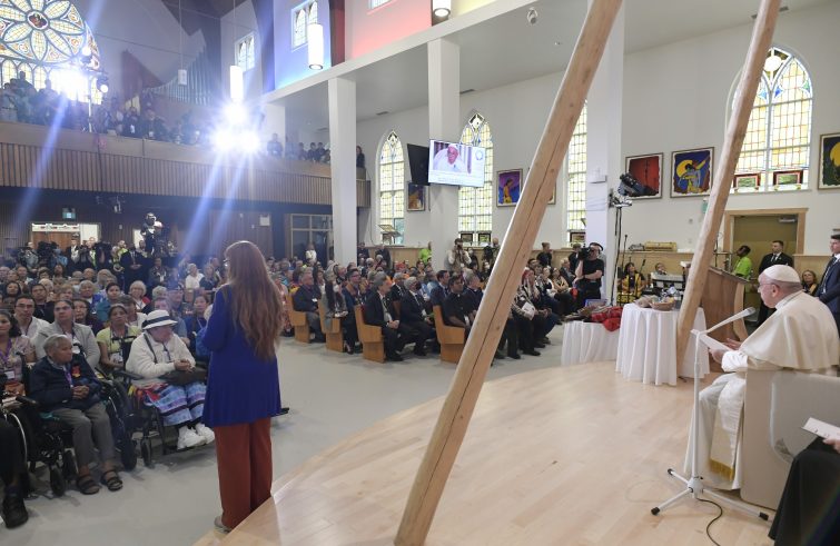 “Nulla può cancellare la dignità violata, il male subìto, la fiducia tradita. E nemmeno la vergogna di noi credenti deve mai cancellarsi. Ma occorre ripartire e Gesù non ci propone parole e buoni propositi, ma la croce, quell’amore scandaloso che si lascia infilzare i piedi e i polsi dai chiodi e trafiggere la testa di spine”. Lo ha detto il Papa, che incontrando ieri ad Edmonton le popolazioni indigene e la comunità parrocchiale della Chiesa del Sacro Cuore ha citato ancora una volta le “ferite tanto dolorose” causate ai nativi dalla politica di assimilazione e ha indicato la direzione da seguire per la riconciliazione: “Guardare insieme Cristo, l’amore tradito e crocifisso per noi; guardare Gesù, crocifisso in tanti alunni delle scuole residenziali”. “Se vogliamo riconciliarci tra di noi e dentro di noi, riconciliarci con il passato, con i torti subiti e la memoria ferita, con vicende traumatiche che nessuna consolazione umana può risanare, lo sguardo va alzato a Gesù crocifisso, la pace va attinta al suo altare”, il monito di Francesco: “Perché è proprio sull’albero della croce che il dolore si trasforma in amore, la morte in vita, la delusione in speranza, l’abbandono in comunione, la distanza in unità. La riconciliazione non è tanto un’opera nostra, è un dono che sgorga dal Crocifisso, è pace che viene dal Cuore di Gesù, è una grazia che va chiesta”.