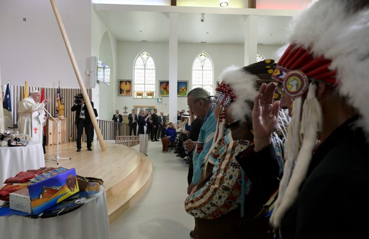 “La riconciliazione operata da Cristo non è stata un accordo di pace esterno, una sorta di compromesso per accontentare le parti. Nemmeno è stata una pace calata dal cielo, arrivata per imposizione dall’alto o per assorbimento dell’altro”. Lo ha precisato il Papa, incontrando ieri le popolazioni indigene e i membri della comunità parrocchiale nella Chiesa del Sacro Cuore ad Edmonton. “È Gesù che ci riconcilia fra di noi sulla croce, su quell’albero di vita, come amavano chiamarlo gli antichi cristiani”, ha ricordato Francesco: “Voi, cari fratelli e sorelle indigeni, avete molto da insegnare sul significato vitale dell’albero che, congiunto alla terra dalle radici, dà ossigeno attraverso le foglie e ci nutre con i suoi frutti. Ed è bello vedere la simbologia dell’albero rappresentata nella fisionomia di questa chiesa”. “Cristo anima il centro stesso di ogni cultura, per cui non solo il cristianesimo interessa tutte le popolazioni indiane, ma Cristo, nei membri del suo corpo, è egli stesso indiano”, ha detto il Papa prendendo a prestito le parole pronunciate da Giovanni Paolo II nella sua visita in Canada del 1984: “Ed è lui che sulla croce riconcilia, rimette insieme ciò che sembrava impensabile e imperdonabile, abbraccia tutti e tutto”.